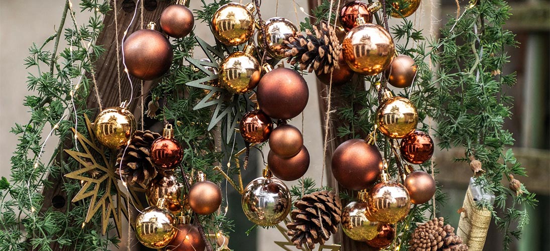 Bolas de árvore de Natal feitas de vidro e plástico e mini bolas de Natal em arame - clássicas ou modernas