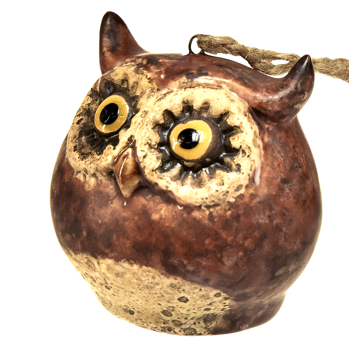 - Três pingentes decorativos de coruja em diferentes tons de marrom