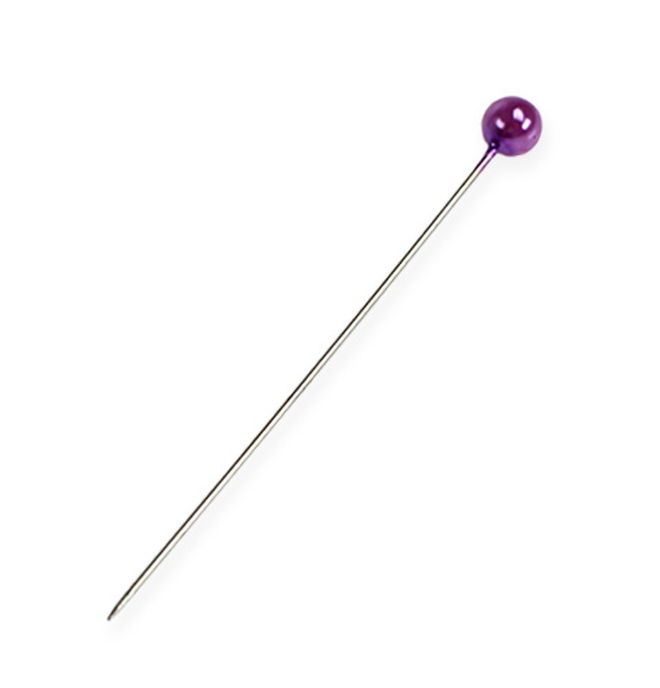 As agulhas com cabeça de pérola em roxo são entregues em uma prática caixa suspensa com 100 exemplares cada. Uma agulha tem cerca de 65 milímetros de comprimento; a pérola tem um diâmetro de cerca de 6 milímetros.