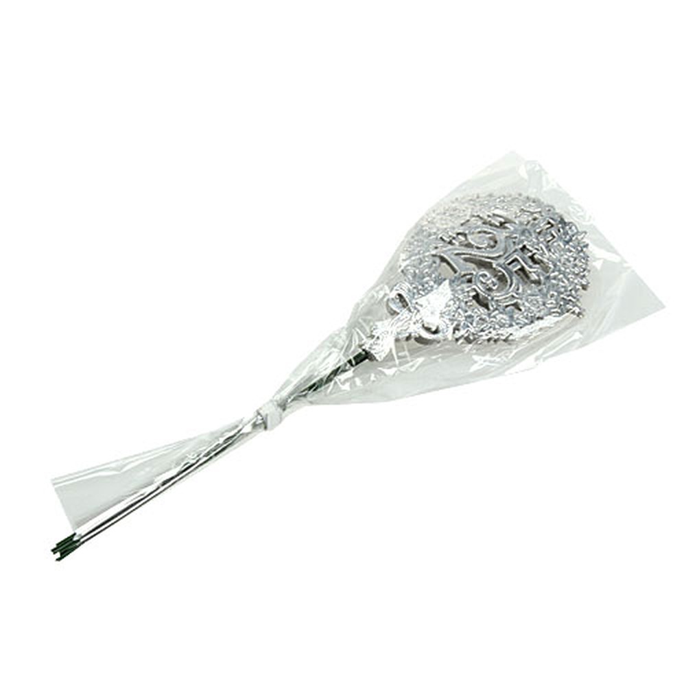 O número de aniversário de prata "25" é fornecido em um pacote de 10. Cada ficha decorativa para o aniversário tem um comprimento total de cerca de 28 centímetros. O emblema, que foi feito de papelão gofrado e mostra o "25" junto com uma coroa e um laço, tem aproximadamente 8 por 12 centímetros de tamanho. O próprio número mede aproximadamente 3,3 x 3,5 centímetros.