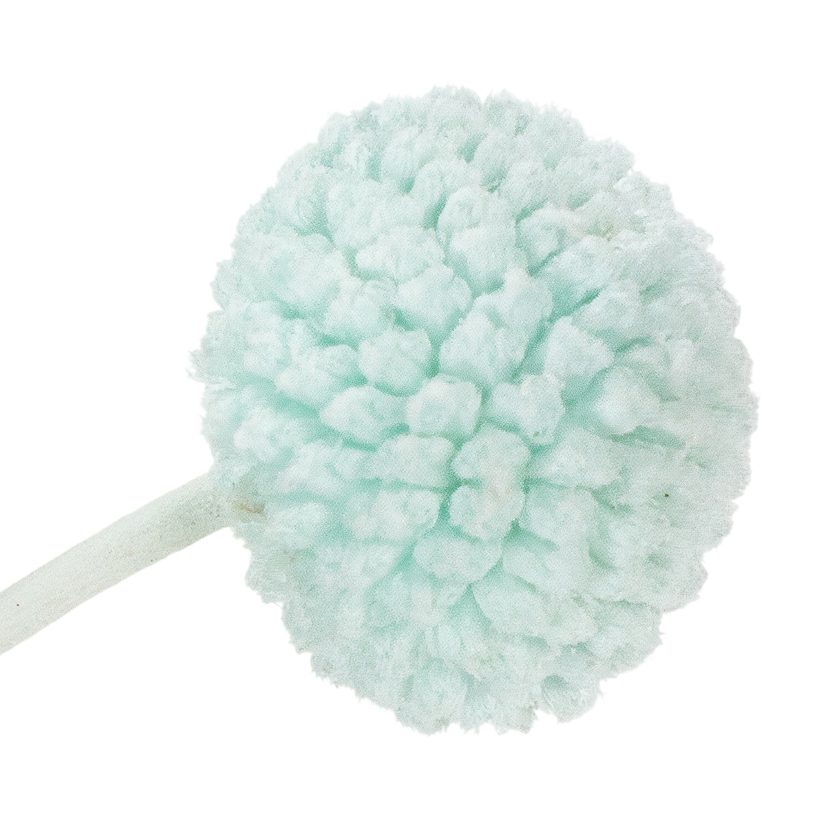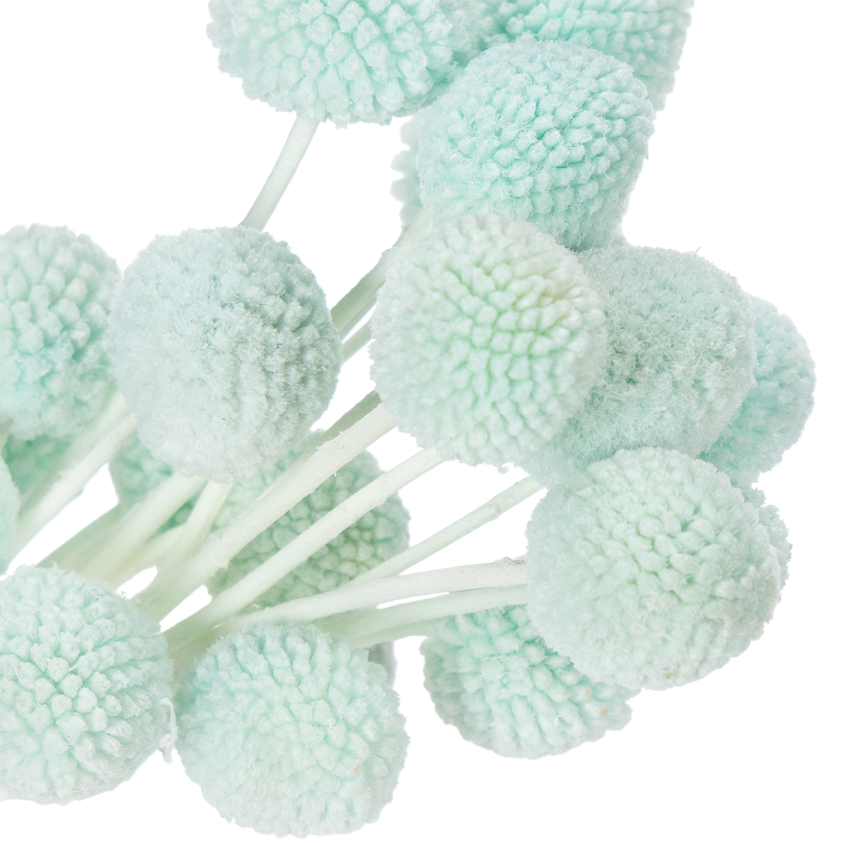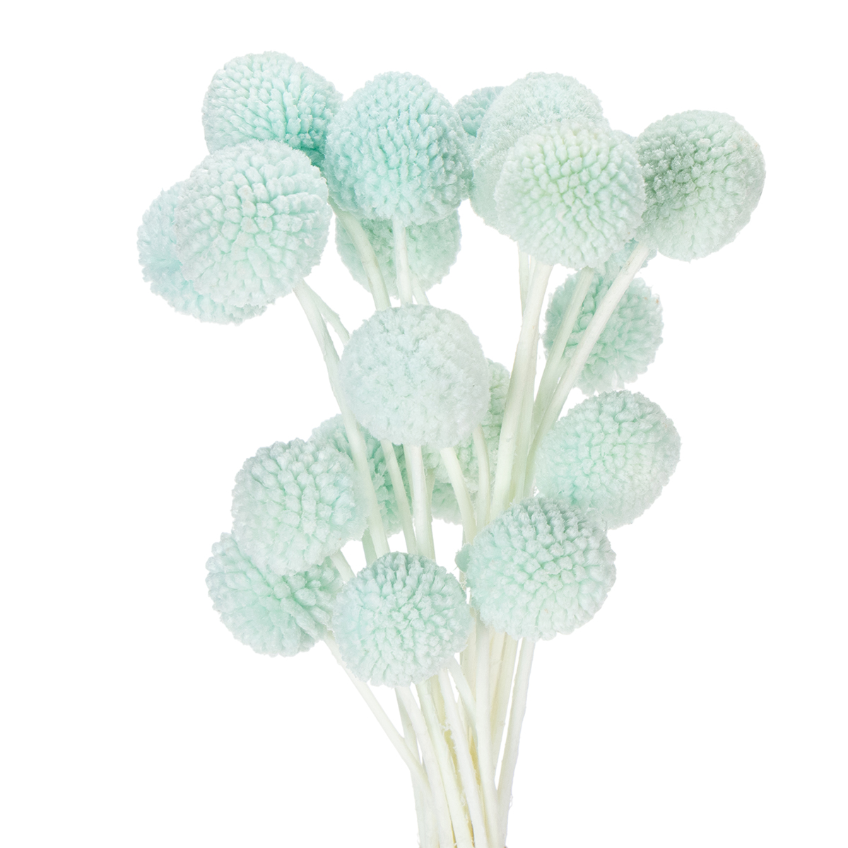 As cabeças das flores de Craspedia têm um diâmetro de cerca de dois a três centímetros, tornando o buquê um arranjo de mesa atraente. Os caules de cor natural criam um contraste encantador com o vibrante azul menta. O buquê fica particularmente decorativo em vasos minimalistas ou como complemento a um arranjo maior com outras flores secas. Combine-o, por exemplo, com capim-dos-pampas ou eucalipto para um visual leve e moderno.