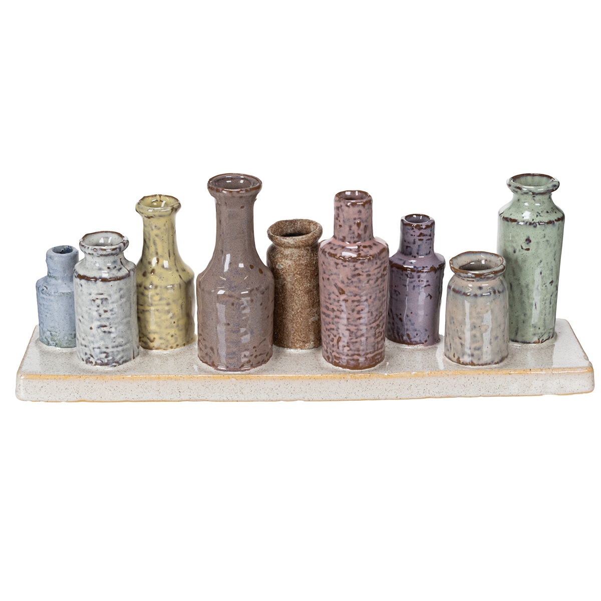 - 9 pequenos vasos de cerâmica feitos à mão em cores coordenadas.