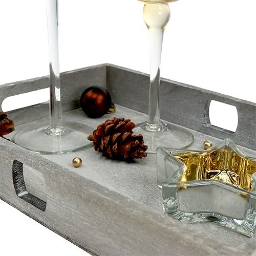 Se precisa de uma decoração de Natal rápida e eficaz, este conjunto com tabuleiro decorativo e luz de vidro na cor dourada é a melhor escolha! A bandeja de madeira resistente e de alta qualidade foi pintada de cinza e levemente lavada de branco e possui ranhuras para transporte nas duas extremidades curtas. Este conjunto também inclui dois copos de luz azul de diferentes tamanhos, cujo cálice é segurado em uma forma levemente curvada e lembra uma flor de tulipa. Além disso, essas taças foram borrifadas com uma tinta de laca dourada, de forma que algumas áreas livres ainda apresentassem o vidro transparente. Quando há uma luz azul acesa no vidro, você pode conseguir um fascinante jogo de cores, que vai levar seus quartos a fantásticos mundos de luz e inspirar você e seus convidados!Mas isso não era tudo! O conjunto de decoração para a época do Advento inclui ainda um candelabro dourado estrela de chá, duas pinhas verdadeiras, uma pequena bola de Natal dourada e outra castanha e três pérolas decorativas douradas. Isto dá-lhe um pacote quase completo e despreocupado para os seus lindos dias de Natal no que diz respeito à decoração! Claro, você também pode adicionar este pacote de Natal à sua decoração existente ou expandi-la usando cones adicionais, ramos de abeto e um pouco de neve decorativa.