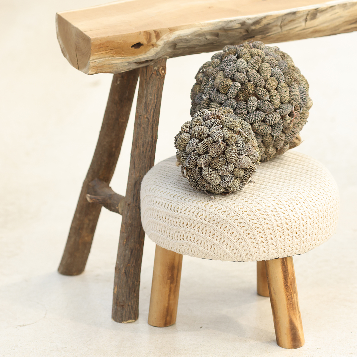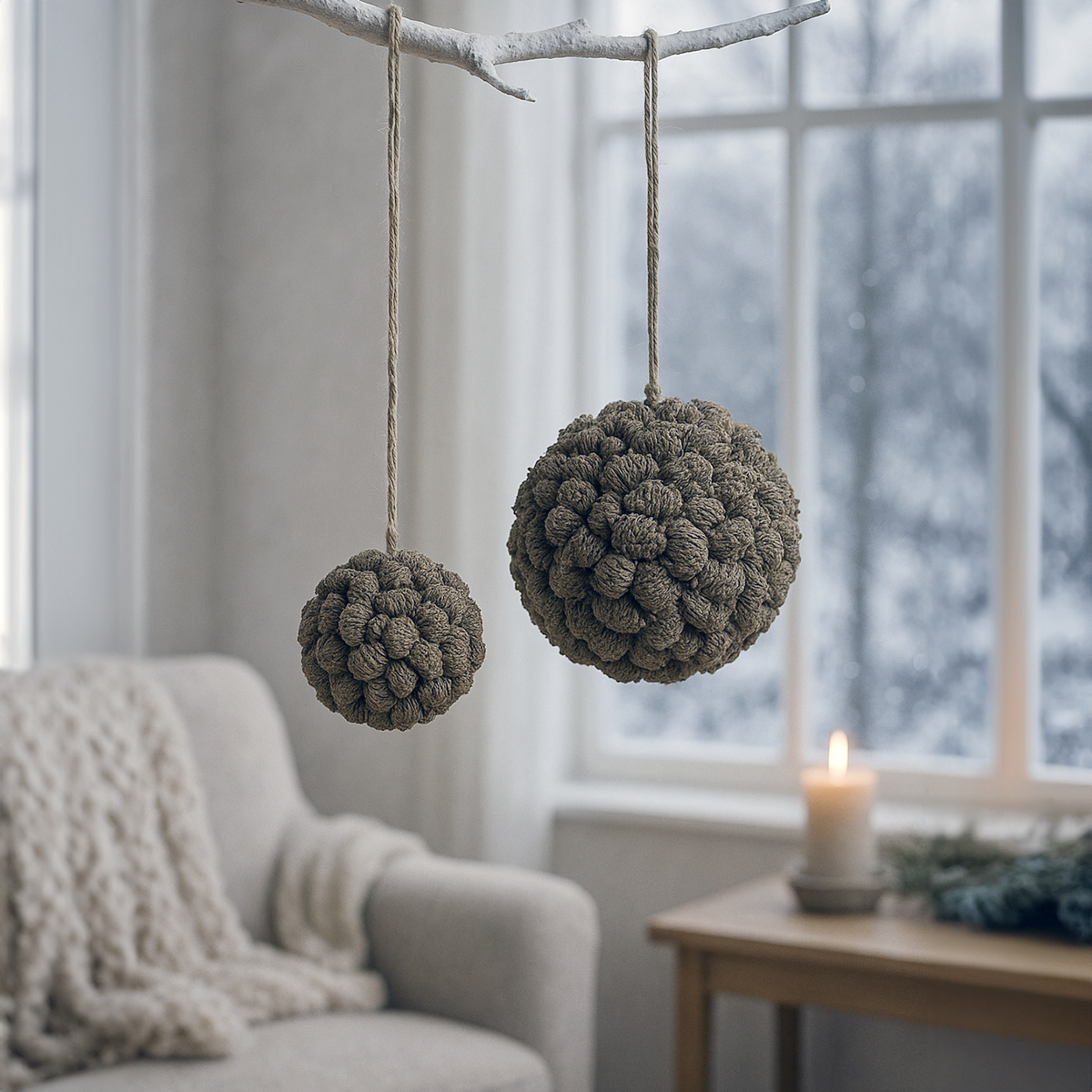 A bola de cone pode ser perfeitamente integrada a esquemas de decoração existentes. Para uma decoração minimalista de inverno, basta pendurá-la em um galho ou colocá-la em um vaso. Para algo mais tradicional, combine-a com frutas vermelhas, galhos de pinheiro ou pequenas luzes. Esta bola também é uma ótima dica para artesanato – ela vai encurtar as tardes frias com projetos criativos do tipo "faça você mesmo"!