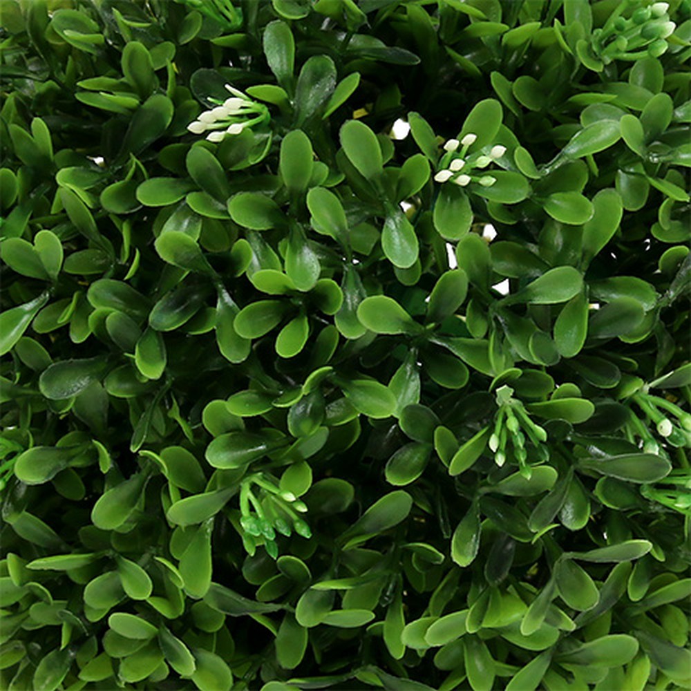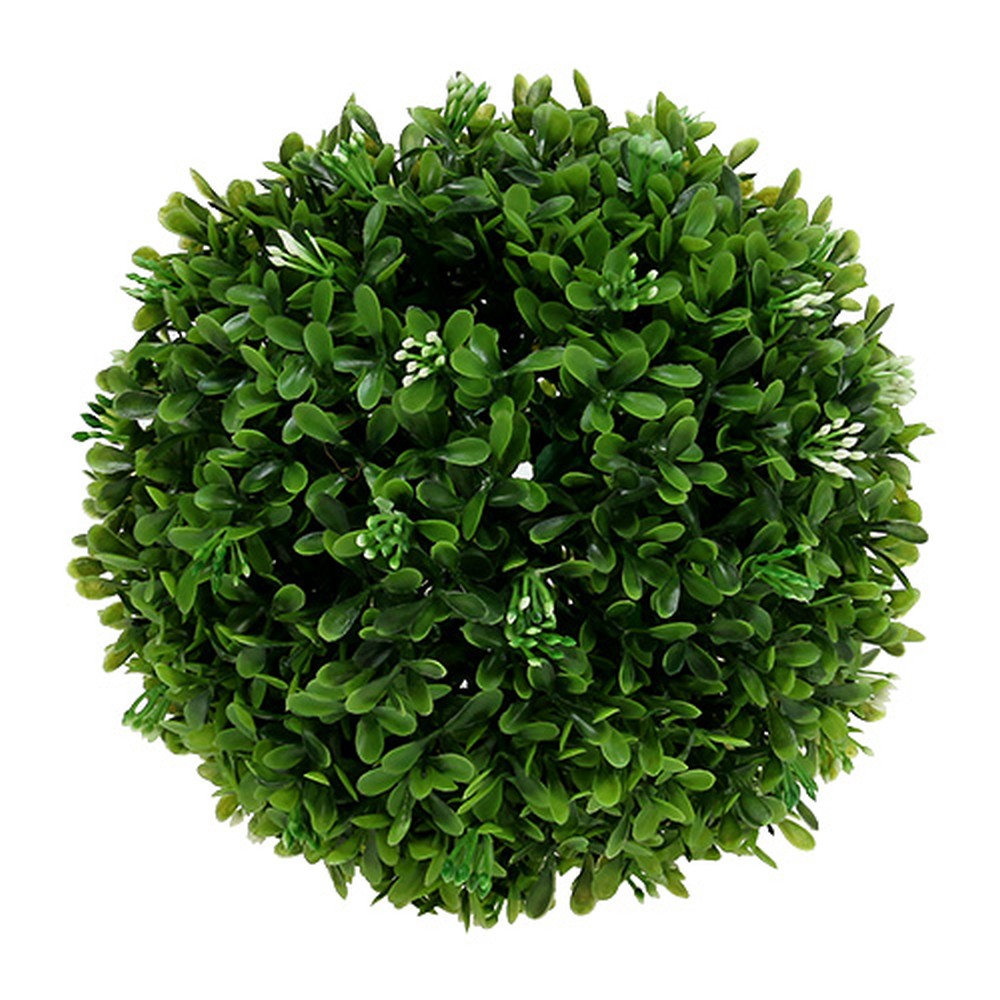 A bola artificial de buxo tem um diâmetro de cerca de 18 centímetros e é feita de plástico resistente às intempéries de alta qualidade. Além das folhas verdes exuberantes da planta artificial, você sempre pode ver pequenas flores brancas fechadas, que literalmente completam o quadro geral da planta decorativa.