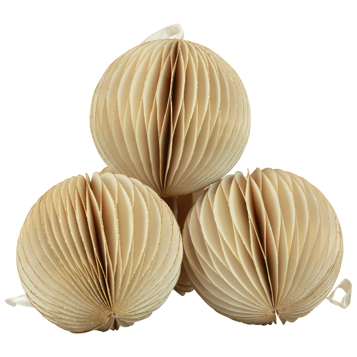 O papel honeycomb manteve sua cor natural e, portanto, é menos branco e mais cremoso. Você também pode dar um pouco mais de nostalgia à fita de seda branca que você usa para pendurar a bola de favo na árvore de Natal, enfeitando-a com uma fita dourada ou creme.