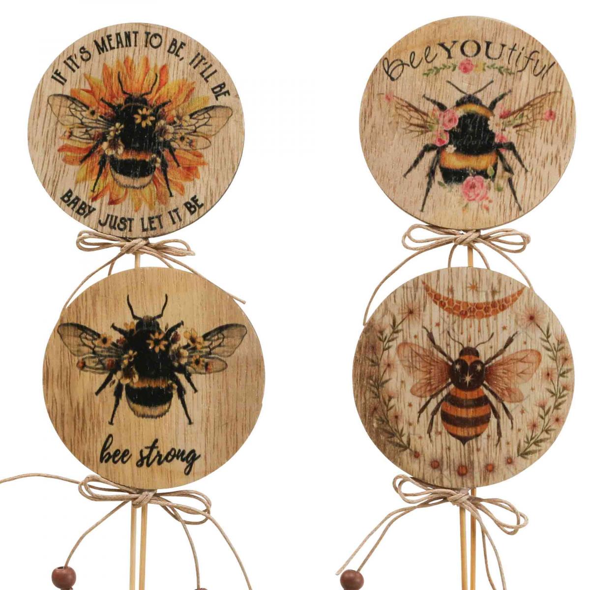 Você obtém quatro motivos diferentes com os doze plugues decorativos. Três deles dizem "Bee strong" em uma bela letra cursiva. Você encontrará as letras "Beeyoutiful" em três outros bastões de madeira decorativos. Outro mostra o texto "Se for para ser, será, baby, deixe ser". Em três outros alfinetes de abelha, você vê uma guirlanda de flores à esquerda e à direita, em vez da escrita e, acima dela, uma lua e algumas estrelas desenhadas como um favo de mel gotejante.