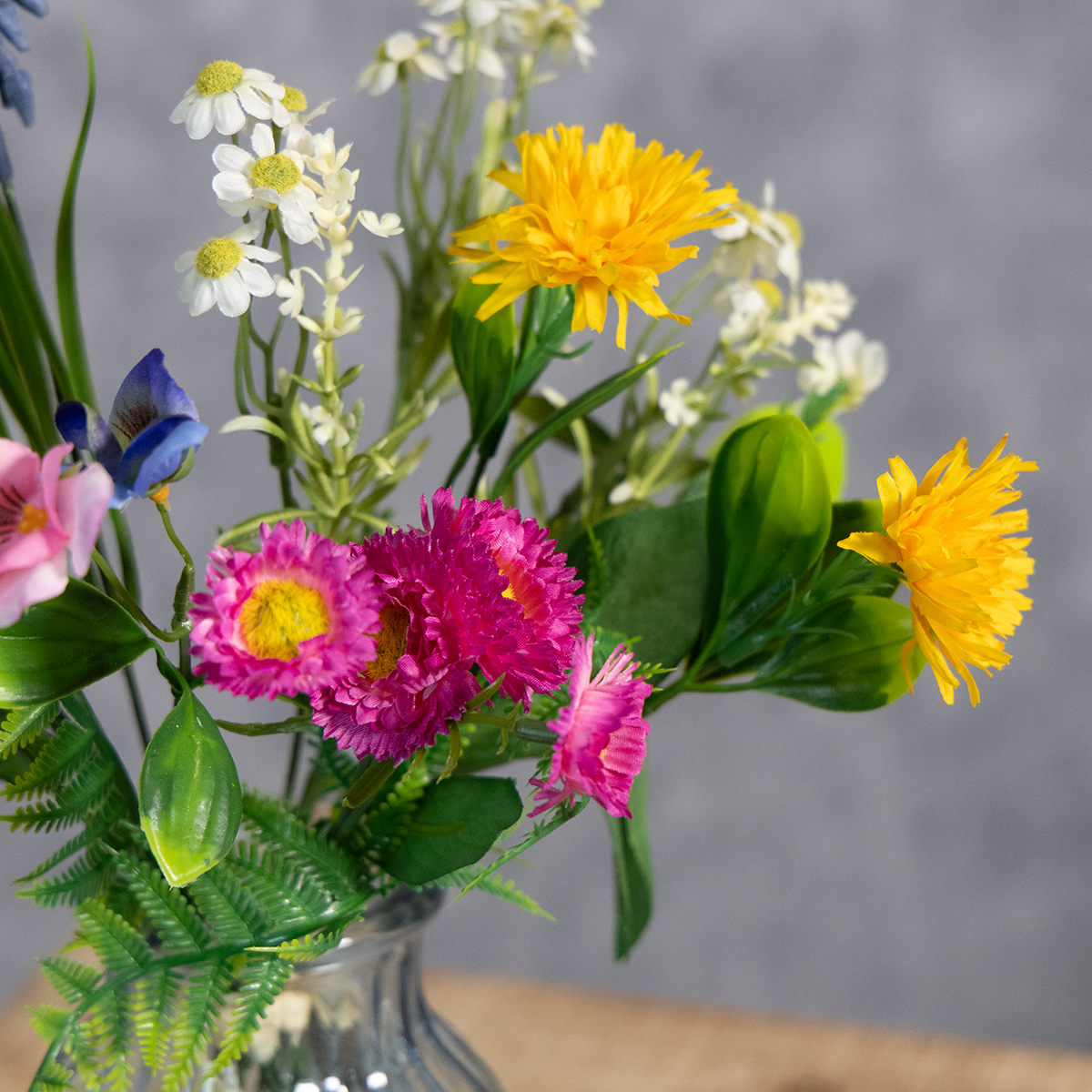 Este buquê de flores artificiais de cores vibrantes, com seus detalhes em tons alegres de amarelo, rosa e azul, traz a sensação da primavera para sua casa. Feito de poliéster e plástico de alta qualidade, ele tem uma aparência incrivelmente realista e impressiona pela excepcional resistência da cor e pela capacidade de manter a forma. A combinação de flores coloridas da primavera com tons de verde natural o torna particularmente versátil: complementa uma decoração rústica, realça o estilo escandinavo e harmoniza-se igualmente bem com designs modernos.