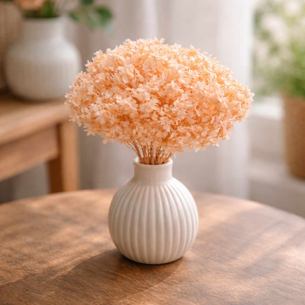 Nossa hortênsia seca se adapta perfeitamente a qualquer ambiente, seja moderno, escandinavo ou com um toque romântico campestre. As grandes flores de hortênsia em tom laranja claro conferem à sua decoração um caráter suave e acolhedor, certamente atraindo olhares. Coloque o buquê em um vaso simples para realçar sua beleza natural ou combine-o com outras flores secas para um arranjo mais sofisticado. É especialmente indicado para decoração de salas de estar e de jantar, mas também para casamentos e eventos. Apenas um buquê é suficiente para preencher um ambiente com elegância floral.