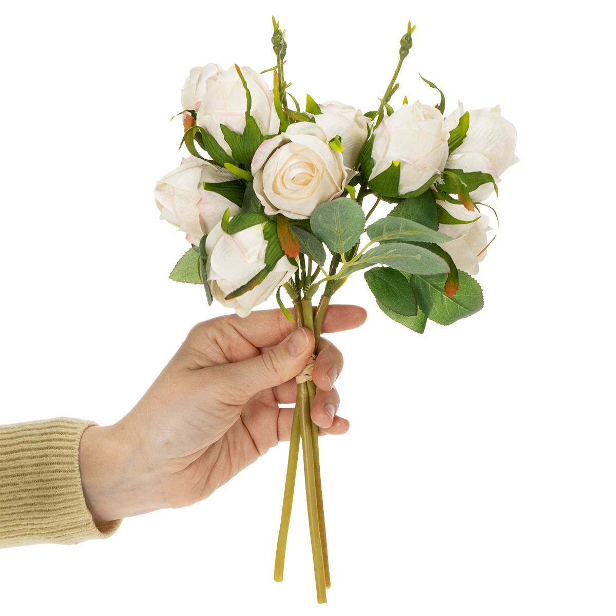 Procura uma decoração elegante, duradoura e deslumbrante? O nosso ramo artificial de rosas brancas é a escolha perfeita! Com 31 cm de altura e três belas hastes, este ramo certamente será o centro das atenções na sua mesa ou no seu quarto. A combinação do branco puro com delicados toques de rosa confere-lhe uma elegância natural, quase indistinguível das flores verdadeiras. E é especialmente prático: este ramo mantém-se sempre fresco, não requer manutenção e é incrivelmente versátil. Seja para jantares românticos, ocasiões festivas ou como destaque na decoração da sua sala de estar, este ramo artificial certamente impressionará.