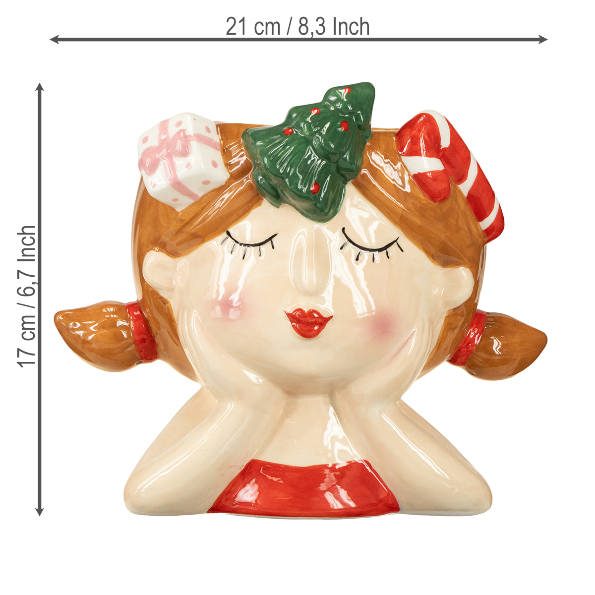O Natal está chegando e você está procurando algo para tornar sua decoração festiva verdadeiramente única? Então, este encantador vaso de cerâmica vai te fazer sorrir instantaneamente! Com seu design encantador no formato de uma menina sonhadora com enfeites de Natal no cabelo, este vaso não só traz um alegre espírito natalino para sua casa, como também destaca lindamente qualquer planta ou decoração de Advento. Particularmente marcantes são os detalhes carinhosos do busto, como as fitas vermelhas, seu olhar sonhador e os pequenos elementos natalinos, como uma mini árvore de Natal e um bastão de doces no cabelo. Isso torna o vaso perfeito para quem quer adicionar um toque de humor à sua decoração!