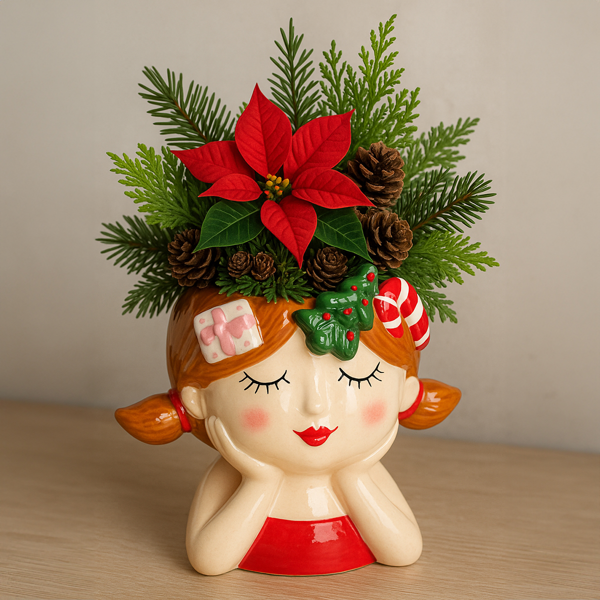 Cabeça de planta cerâmica menina plantador decorativo natal altura 17cm