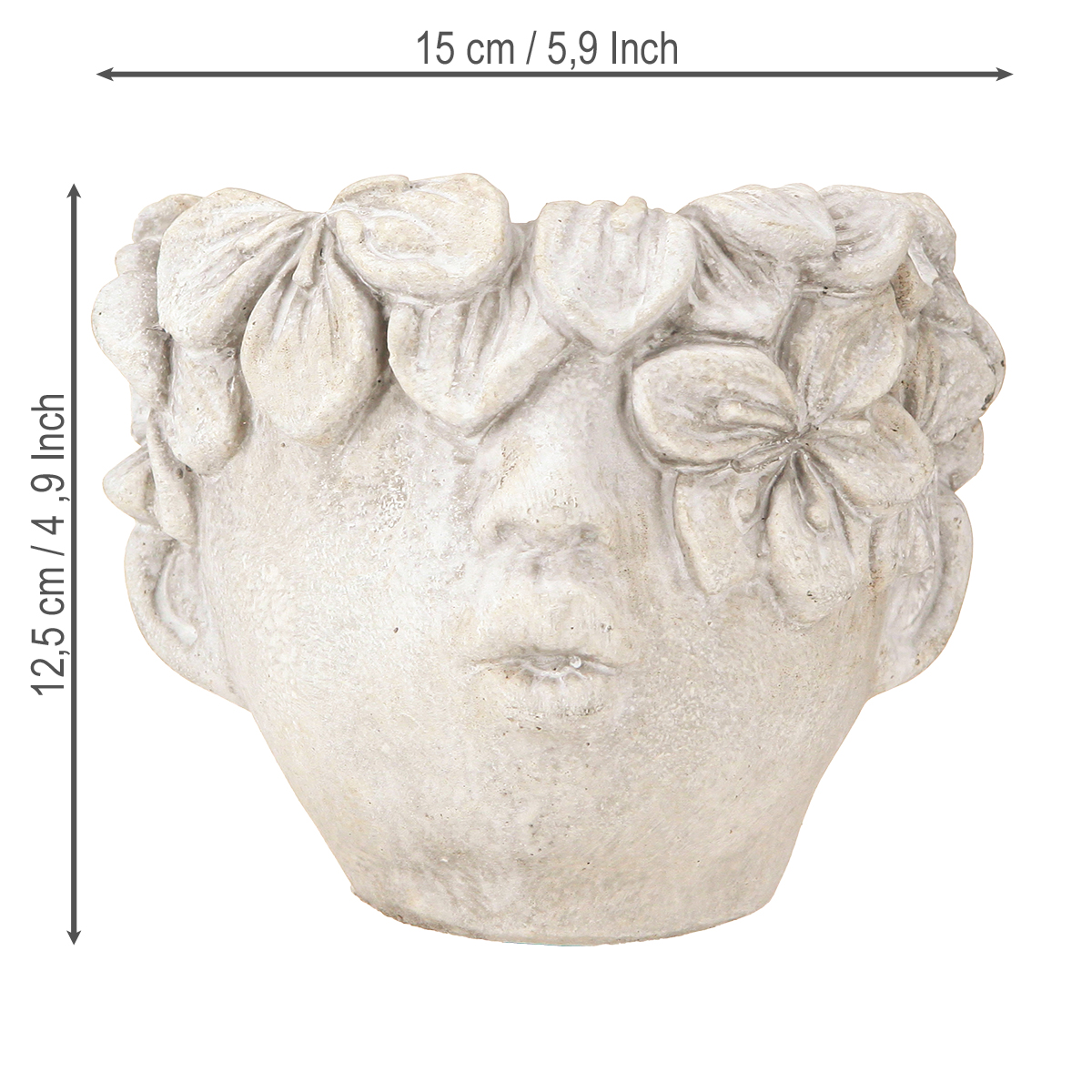A cabeça para plantio foi feita de pedra artificial com aparência de concreto e cuidadosamente projetada. O nariz, as orelhas e os lábios da cabeça da planta, que formam uma boca de beijo, são artisticamente projetados. A cabeça do busto decorativo é coberta por uma coroa de flores encantadoras, cujas flores também cobrem a área dos olhos da decoração de concreto. O vaso de flores é perfeito para expor suas plantas de uma forma atraente!