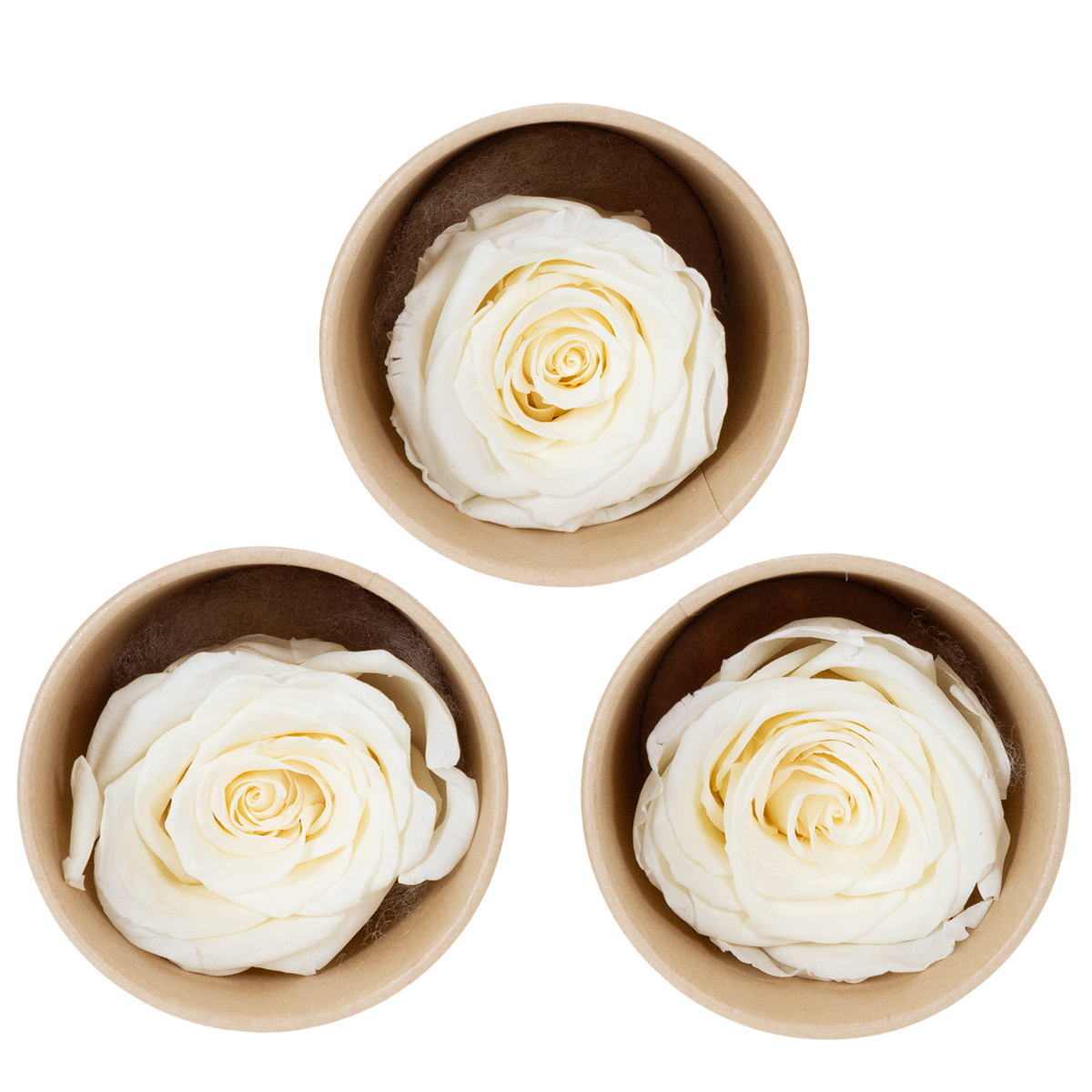 Estas cabeças de rosas brancas preservadas combinam harmoniosamente estética e durabilidade. Medindo aproximadamente 4 centímetros de diâmetro e 5 centímetros de altura, elas se encaixam perfeitamente em diversos estilos decorativos. Sua elegante cor branca se integra com perfeição a ambientes românticos, sejam eles vintage, rústicos ou minimalistas modernos. As cabeças de rosas foram cuidadosamente preservadas para manter sua forma, cor e textura por muitos anos.