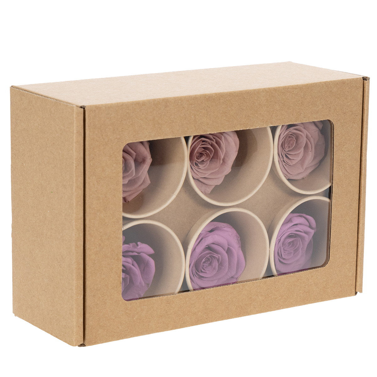 Nossas rosas preservadas em um elegante tom lilás são verdadeiras coringas e a companhia perfeita para momentos especiais. Você receberá seis lindas rosas, cada uma com 4 cm de diâmetro e 5 cm de altura. O processo especial de preservação garante que as rosas mantenham sua forma, cor e beleza naturais sem qualquer manutenção. Sem água, sem murchar – estas rosas são feitas para durar para sempre. Coloque-as como um elegante arranjo de mesa no seu casamento, use-as em projetos de artesanato criativos ou ofereça-as como um presente romântico de aniversário. O tom lilás quente exala uma tranquilidade mágica e complementa lindamente decorações modernas ou toques de estilo vintage.