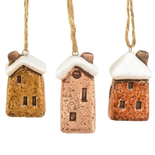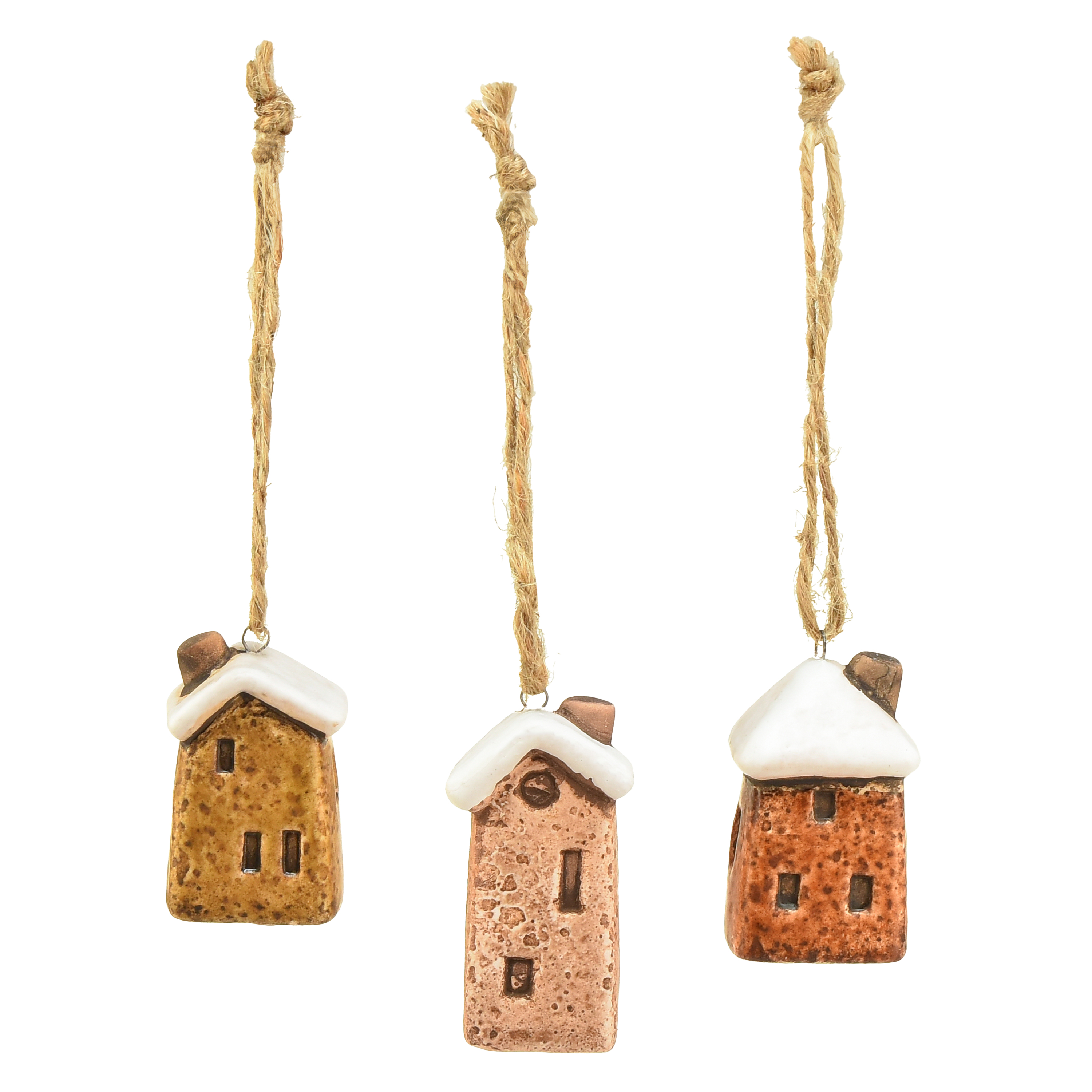 Casas suspensas de cerâmica - Vários tons de marrom, telhados revestidos de neve - Decoração de Natal encantadora - Pacote de 6
