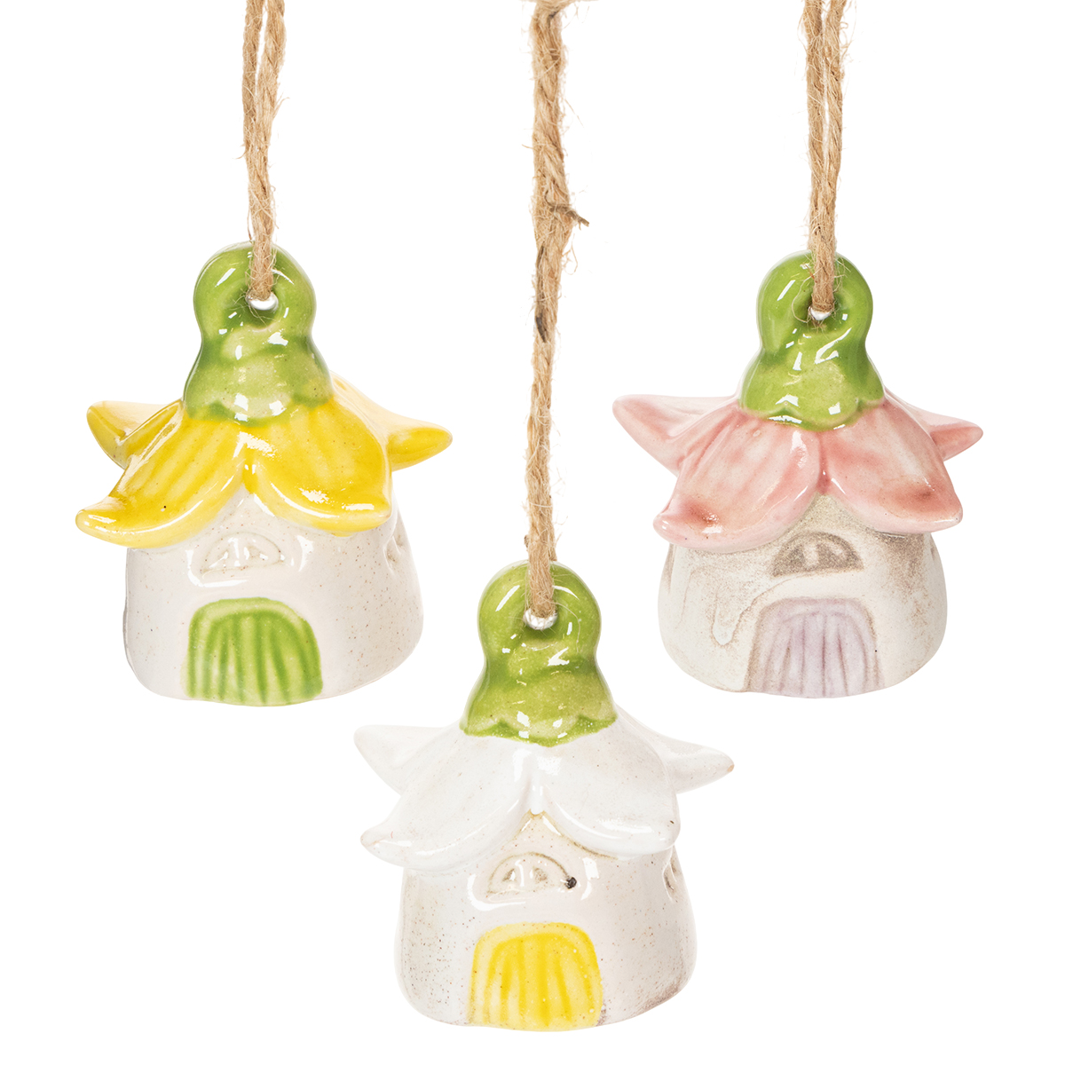 Casinha de fada de cerâmica com flor para pendurar, 6 cm, 6 peças