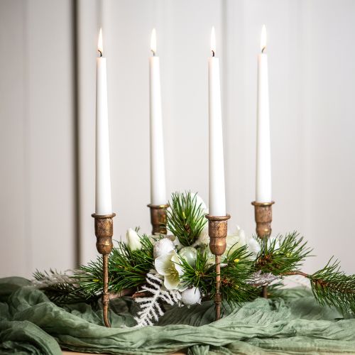 Adicione um toque de luxo e aconchego à sua casa com nosso requintado castiçal dourado. Este castiçal de metal com design antigo acomoda 4 velas e é o complemento perfeito para uma mesa festiva ou jantar romântico.