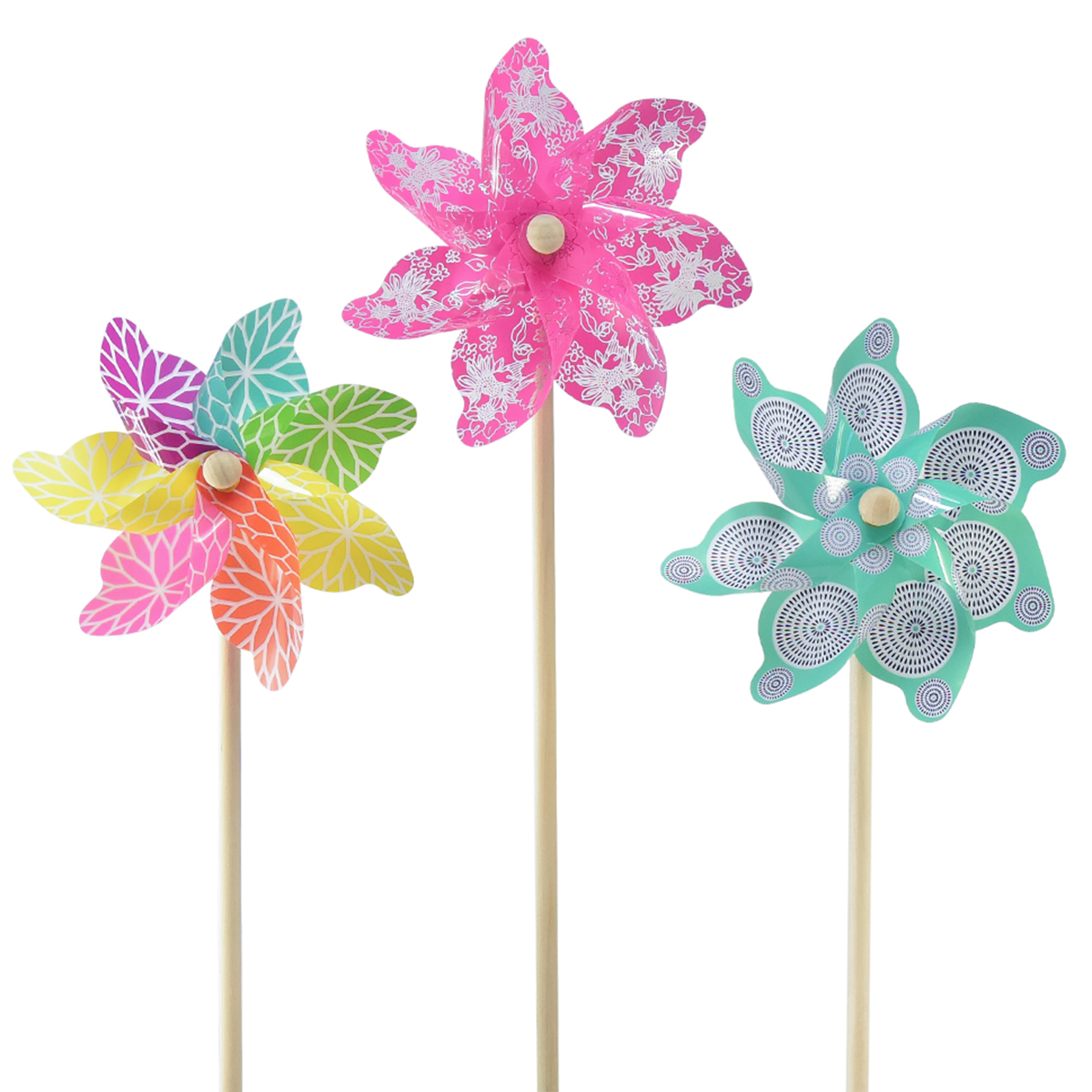 Você obtém um total de 3 turbinas eólicas que diferem em padrão e cor. Um moinho de vento é rosa e decorado com um padrão de flor parcialmente transparente. O catavento turquesa possui círculos pretos e brancos e o terceiro possui uma cor diferente em cada folha, pontuada por uma grande flor bordada em branco.