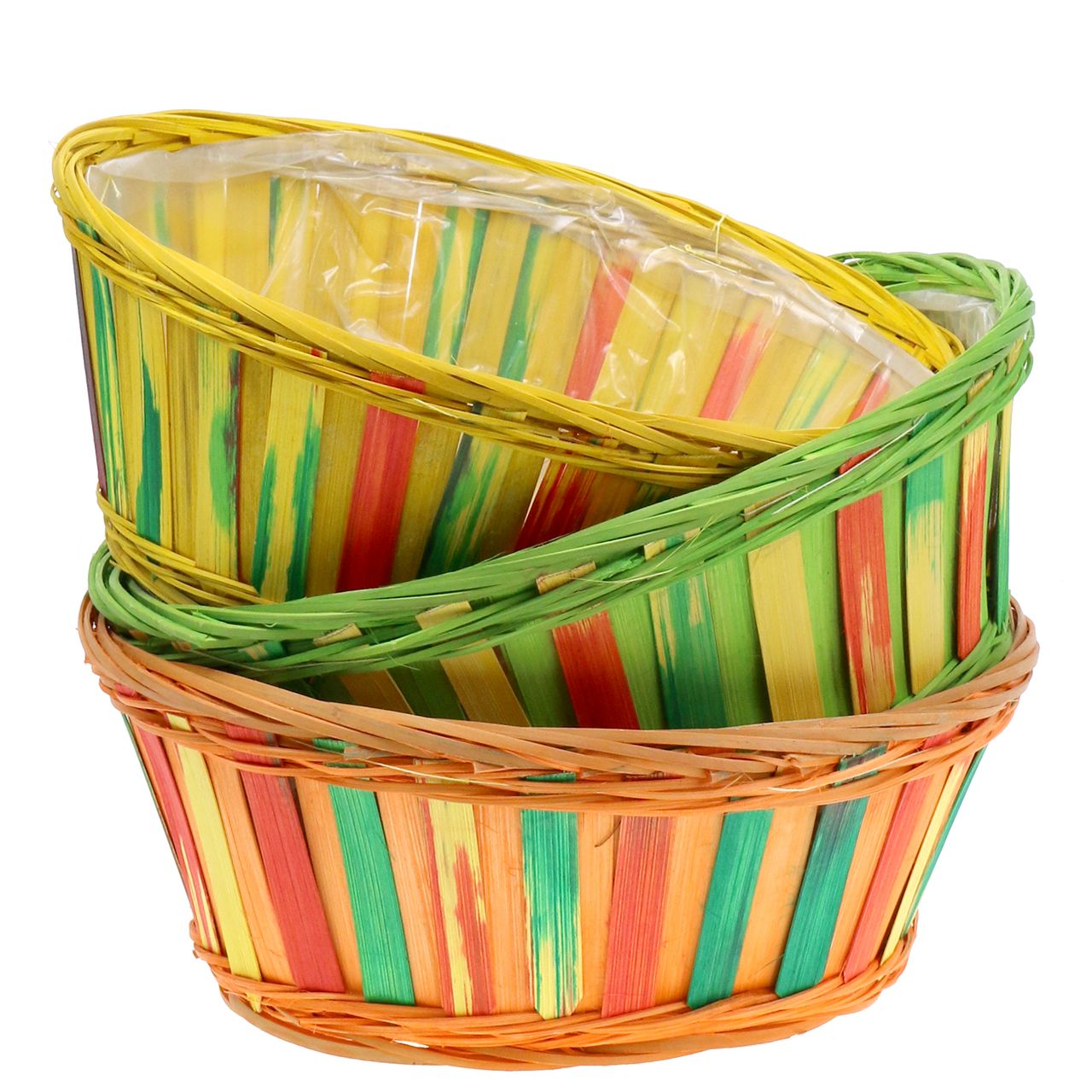 Feliz, colorido, delicioso! Este cesto de batatas fritas de alta qualidade é o destaque na decoração de primavera e pode ser usado tão individualmente quanto você tiver ideias. A cesta de madeira redonda é tecida com várias aparas de madeira e galhos de vime coloridos em cores diferentes. As cores básicas das cestas são laranja, verde e amarelo. Listras coloridas verticais completam o design. No interior já existe um filme plástico, de forma que, por exemplo, o plantio direto com flores e plantas coloridas é possível a qualquer momento e nenhuma água pode vazar após a rega.