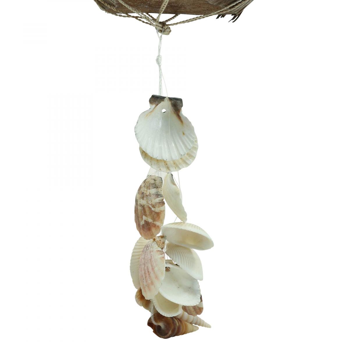 A casca oca do coco fica pendurada em uma rede tecida com fibras naturais. Conchas balançam e tilintam sob esta cesta suspensa. Uma bonita corda feita de fibras naturais envolve um anel de madeira acima da decoração natural. Finalmente, o cabide para a cesta de coco é preso a ele. A decoração marítima também funciona como vaso de flores suspenso e carrilhão de vento!Em seu estado natural, a casca do coco combina perfeitamente com o estilo boho. Junto com as cordas trançadas, o cesto suspenso também pode ser utilizado para decoração de ambientes, onde o macramê enfeita as paredes. O diâmetro de abertura da cesta suspensa é de cerca de 7,5 centímetros. Coloque a casca de coco natural para uma planta suspensa com papel alumínio ou use o coco como uma bela decoração marítima para pendurar.