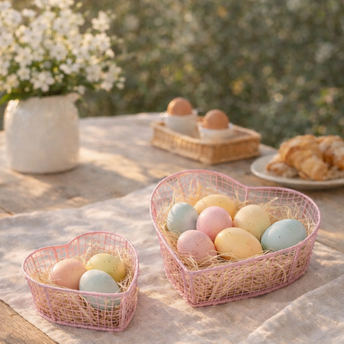 Crie uma atmosfera romântica e organizada com estas lindas cestas de arame em formato de coração. Seja como um detalhe decorativo na mesa, para guardar pequenos objetos ou como um elegante conjunto para presente, estas cestas de metal em formato de coração trazem amor e ordem para sua casa. Feitas de metal resistente, as cestas vêm em tons suaves de rosa e roxo. São perfeitas para uso em salas de estar ou espaços externos protegidos e são a escolha ideal para decorações de mesa românticas em ocasiões especiais como casamentos, Dia dos Namorados ou aniversários.