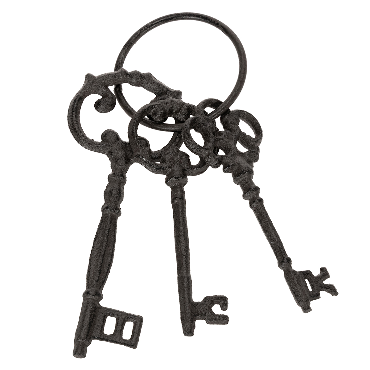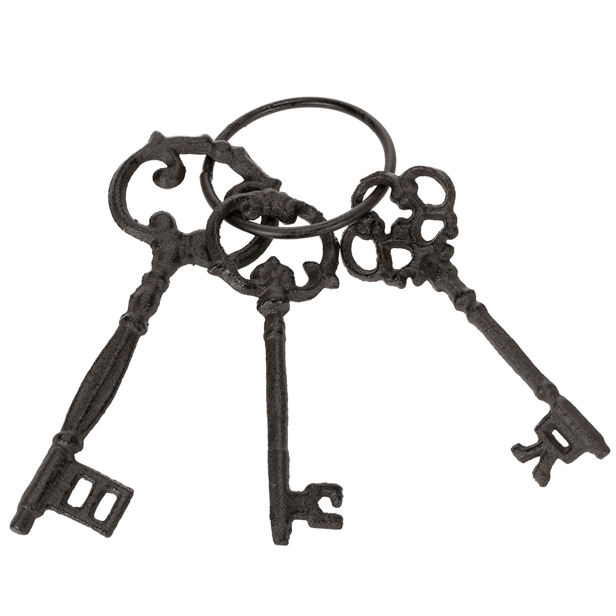 - Design: três chaves diferentes com formatos que remetem a modelos antigos, presas a um anel.