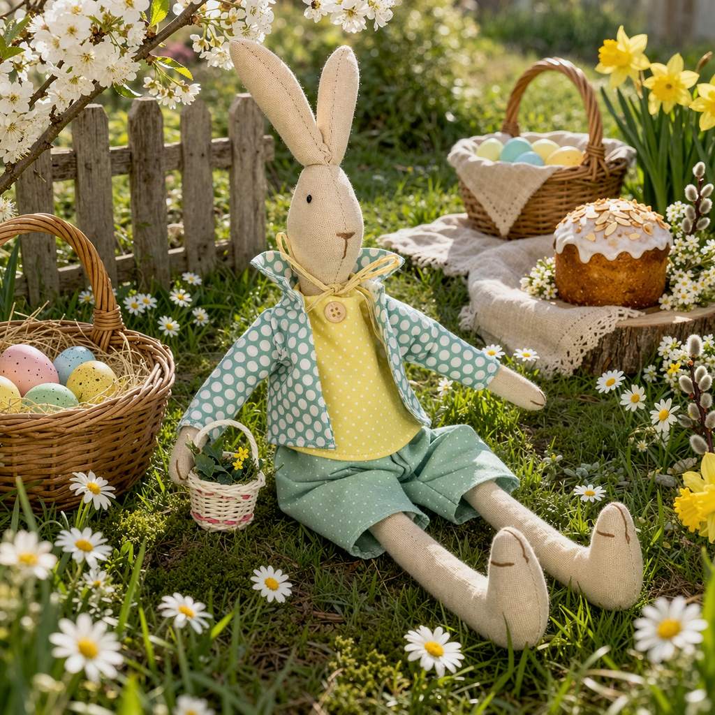 Este menino coelho foi feito à mão com grande atenção aos detalhes. A coelhinha foi feita de tecido natural e vestida com uma camisa amarela com bolinhas brancas e botões de madeira, calça e uma jaqueta combinando em turquesa, também com padrão de bolinhas. O coelhinho da Páscoa usa um laço de papel simples em volta do pescoço. O homem coelho trouxe uma pequena cesta de flores plantadas.
