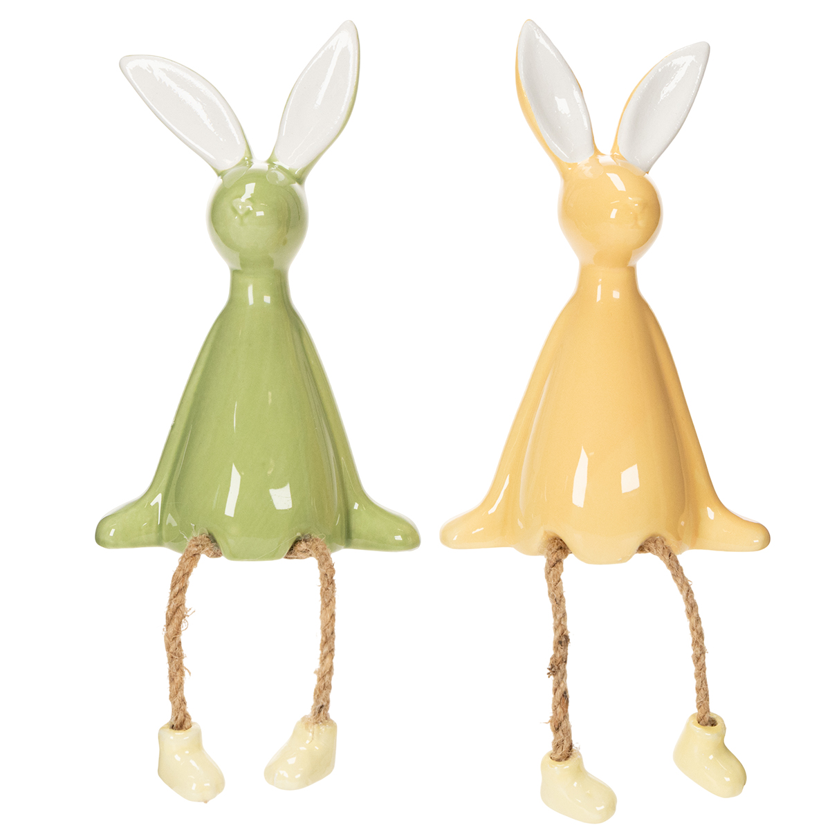 Traga a primavera para sua casa com estes coelhinhos da Páscoa. Um deles brilha em um suave tom verde pastel, enquanto o outro traz o calor do sol para a sua decoração com seu tom amarelo. O delicado trabalho artesanal em cerâmica de alta qualidade os torna não apenas robustos, mas também elegantes. Os pés de corda de juta enfatizam o aspecto natural e adicionam um toque divertido. Perfeitos para colocar em cantos e bordas – seja no parapeito da janela, em uma prateleira ou na borda de uma mesa lateral – os coelhinhos criam uma atmosfera descontraída e informal. A variedade de cores permite que você os combine facilmente com outras peças decorativas. Por exemplo, combine-os com uma cesta de vime cheia de ovos de Páscoa ou complemente-os com flores frescas da primavera em um estilo campestre. Para todos que amam um visual alegre e natural, estes coelhinhos da Páscoa são um item indispensável.