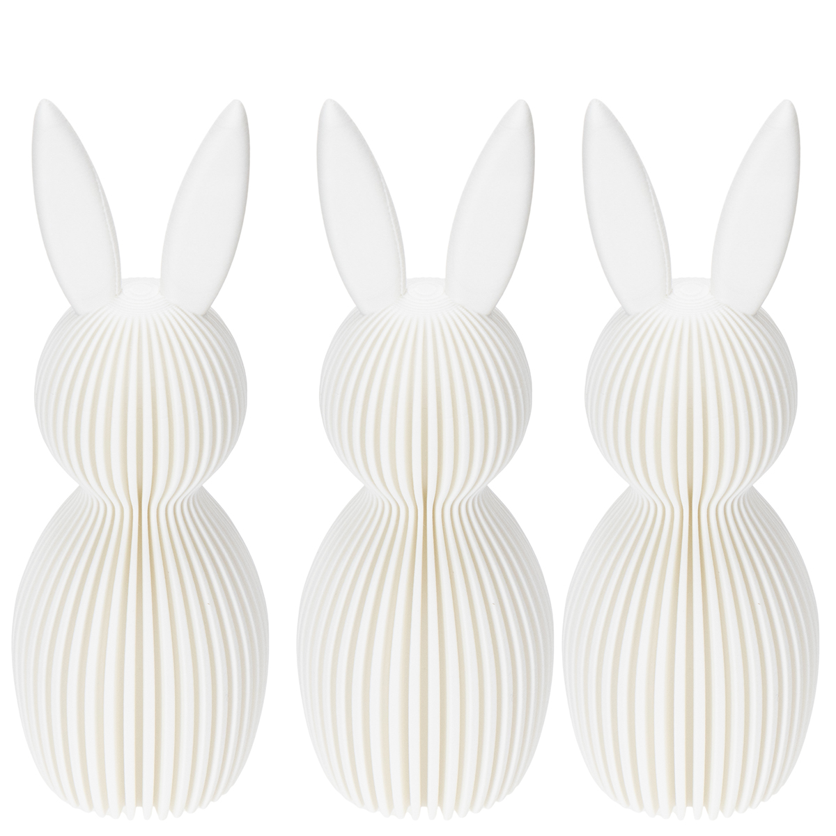 Conjunto de 3 peças com 13 cm de comprimento, composto por uma estatueta decorativa de coelho com um visual plissado, ideal para decoração de interiores moderna, sala de estar ou escritório.