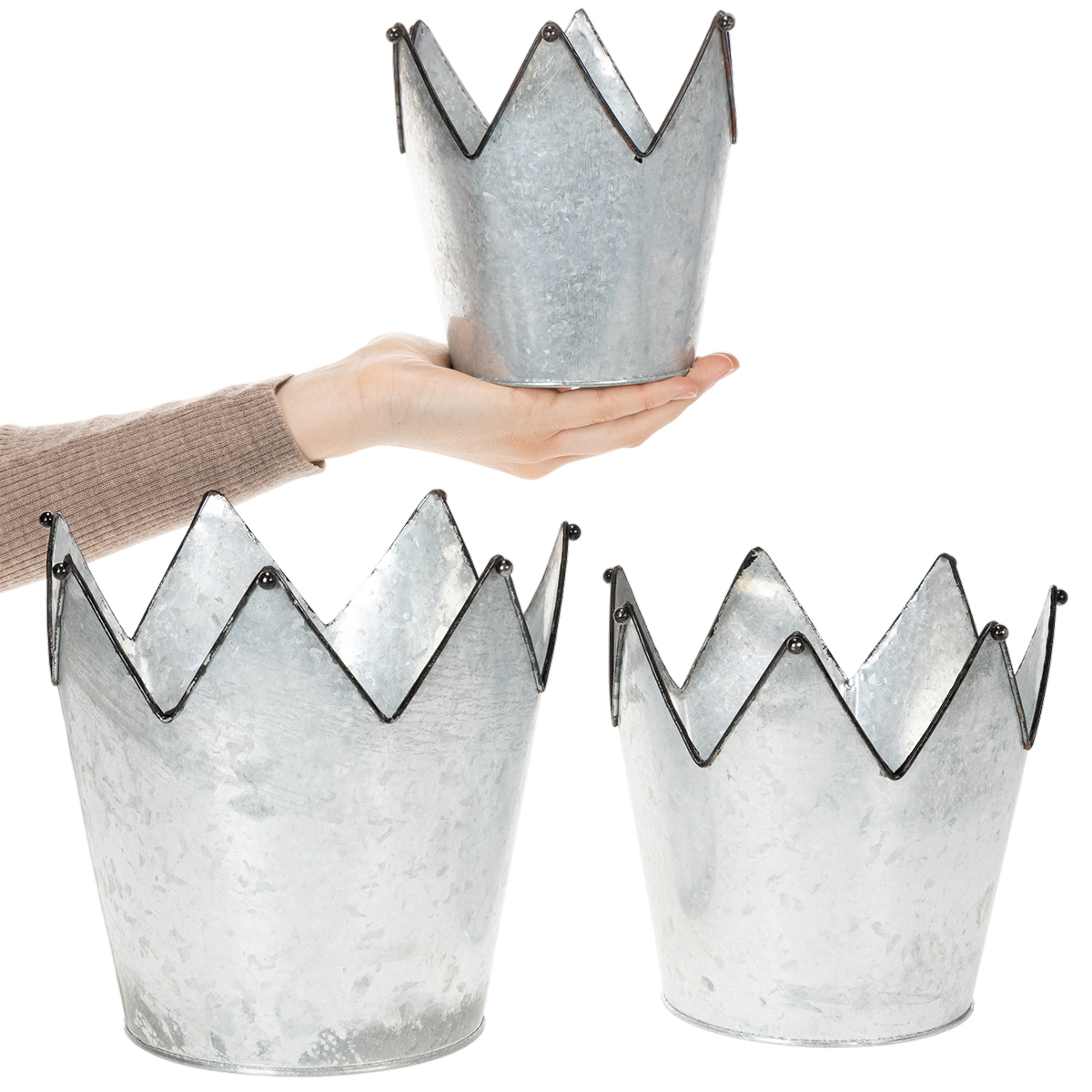 Conjunto de 3 vasos decorativos em metal zinco com coroa, diâmetros de 21,5/19,5/17 cm.