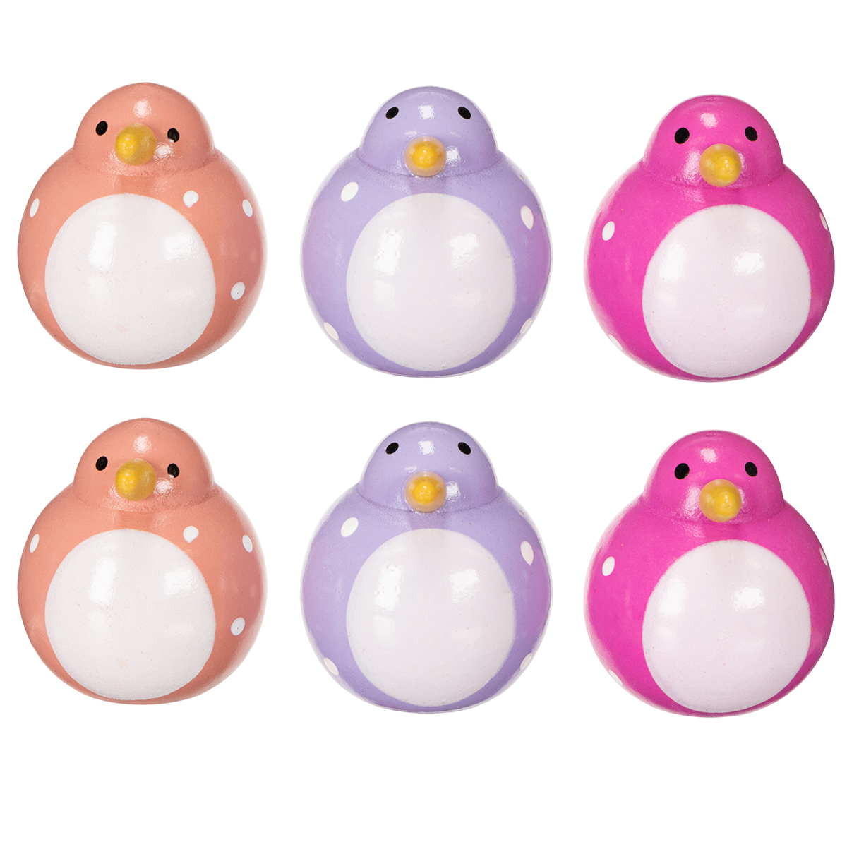 Nome do produto: Conjunto de 6 peças com figuras decorativas de pássaros com estampa de bolinhas, para um toque alegre e descontraído na decoração do ambiente. Cor roxa, 6 cm de altura.
