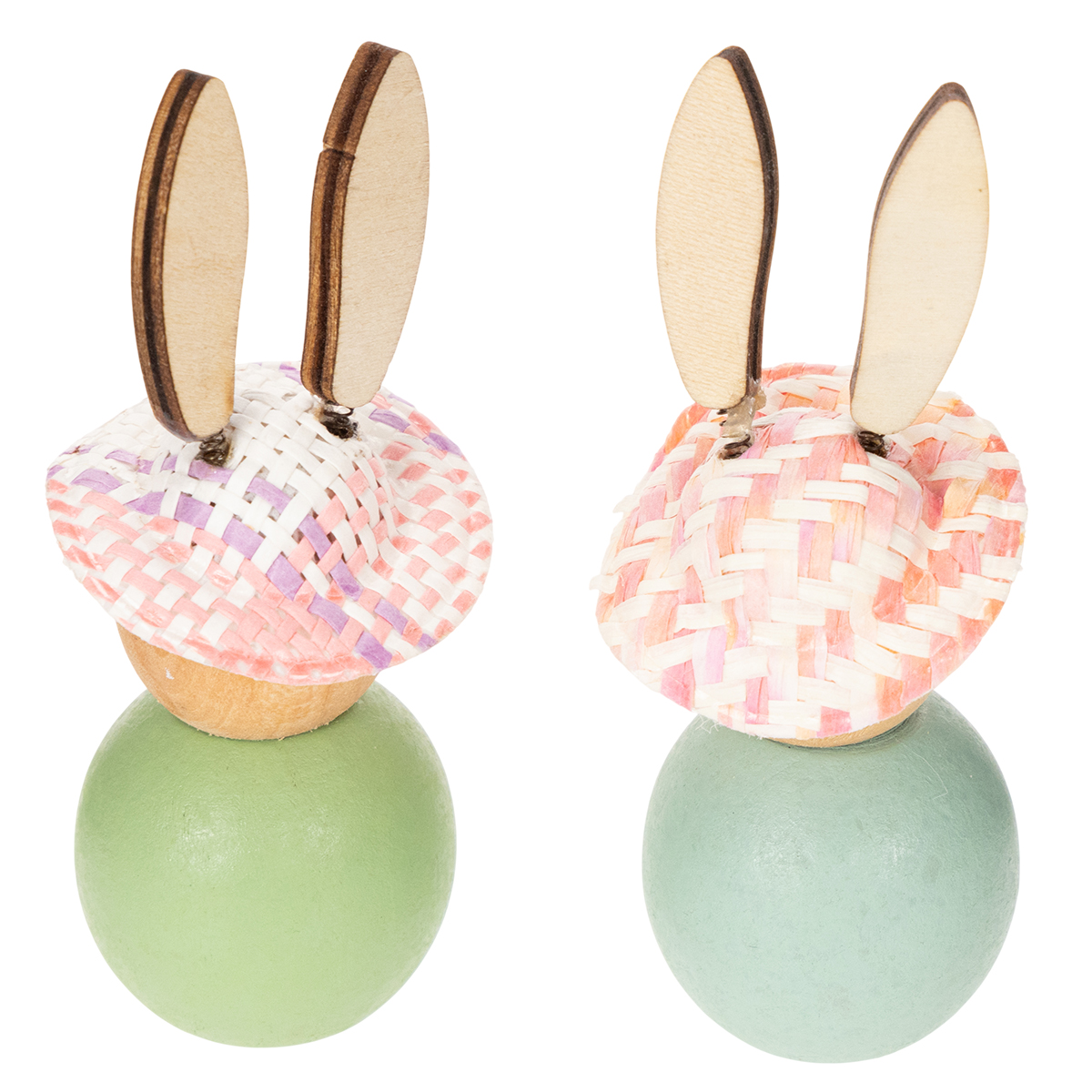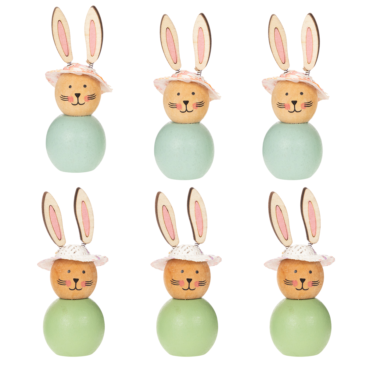 Estas figuras de madeira impressionam pelo seu charme natural e alegria contagiante: a madeira clara combinada com tons suaves de verde e menta resulta num design lúdico. Os chapéus cor-de-rosa, em particular, conferem às figuras um toque vintage elegante. Cada coelho tem aproximadamente 9 cm de altura e traz um toque de primavera para a sua casa. As orelhas com molas de metal não só são visualmente impactantes, como também acrescentam um detalhe vibrante que certamente chamará a atenção.