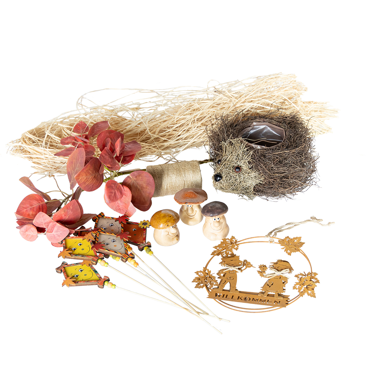 Nosso conjunto de decoração de outono reúne tudo o que você precisa para uma decoração de outono com um toque especial. Este ouriço fofo feito de trepadeiras chamará a atenção em ambientes rústicos e aconchegantes — perfeito para um estilo campestre. Ele é complementado por cogumelos em miniatura em marrom quente, bege e vermelho-ferrugem, além de palitos de flores divertidos, barbante de juta prático, folhas vermelhas de outono realistas como plantas artificiais e uma placa de boas-vindas em tom ferrugem.