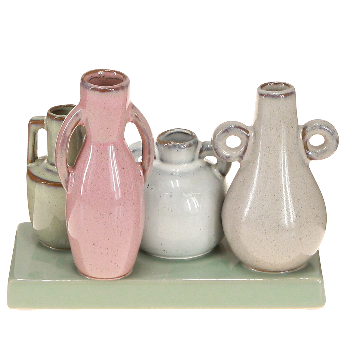 Este conjunto de mini vasos de cerâmica é composto por quatro pequenos vasos dispostos numa bandeja verde simples. Cada vaso tem uma forma única – desde bulbosa a esguia, com pegas decorativas ou curvas suaves. Esta variedade garante que o conjunto crie um visual harmonioso, mantendo, ao mesmo tempo, a sua personalidade individual. A paleta de cores rosa, verde e branca evoca uma frescura primaveril sem ser excessiva. Uma mais-valia: a cerâmica de alta qualidade, com a sua superfície lisa e brilhante, confere ao conjunto um toque de elegância. Quer estejam cheios de flores frescas da primavera, ramos secos ou mesmo vazios, estes pequenos vasos são sempre um sucesso. Adaptam-se perfeitamente a conceitos de decoração minimalista moderna ou escandinava. E para quem prefere um ambiente mais acolhedor, o conjunto também pode ser usado num estilo campestre, talvez combinado com elementos de madeira ou tricô. Simplesmente deslumbrante quando combinado com jogos americanos em tons claros ou castiçais dourados. Graças às suas dimensões compactas (14 cm de comprimento, 7 cm de largura e 11 cm de altura), este conjunto adapta-se praticamente a qualquer lugar: em aparadores estreitos, como peças decorativas na sala de jantar ou como um elegante detalhe em prateleiras. A sua construção robusta garante também uma longa durabilidade. Quem procura uma decoração discreta, mas elegante, ficará encantado.