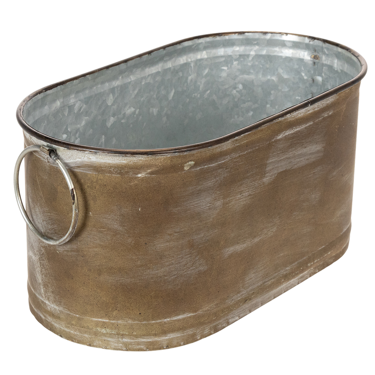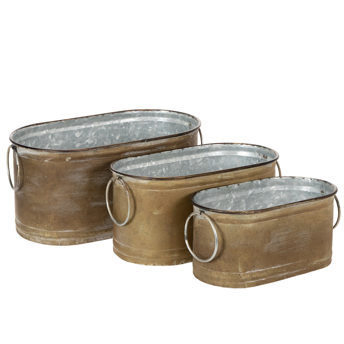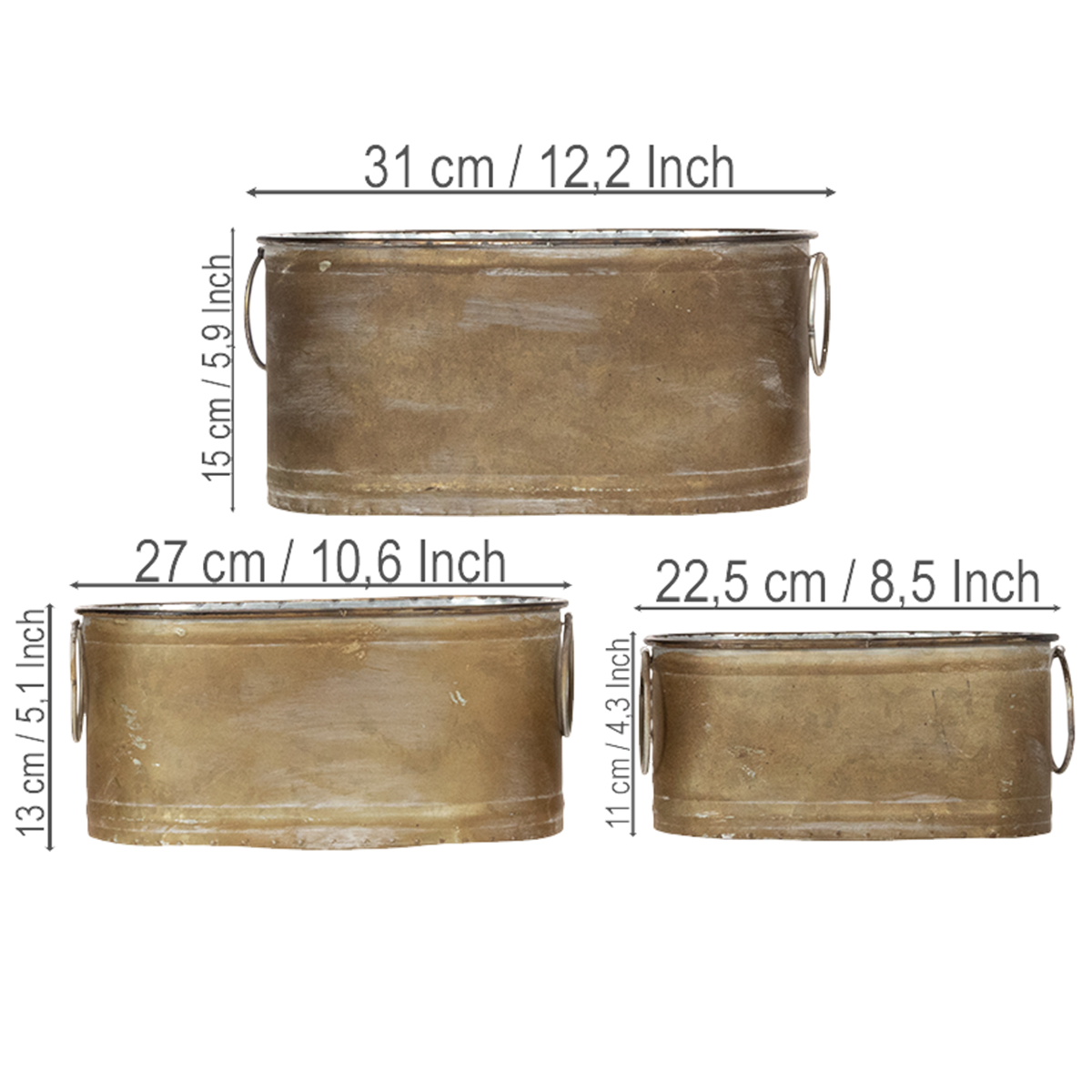 Os cachepots do conjunto de 3 têm a forma de pequenas tinas. A parte externa das banheiras de metal é lavada em branco-cobre. A cor e a forma são retrô em estilo, tornando-as adequadas para uma mesa vintage. O caráter retrô é sublinhado pelos grandes anéis móveis que funcionam como alças.