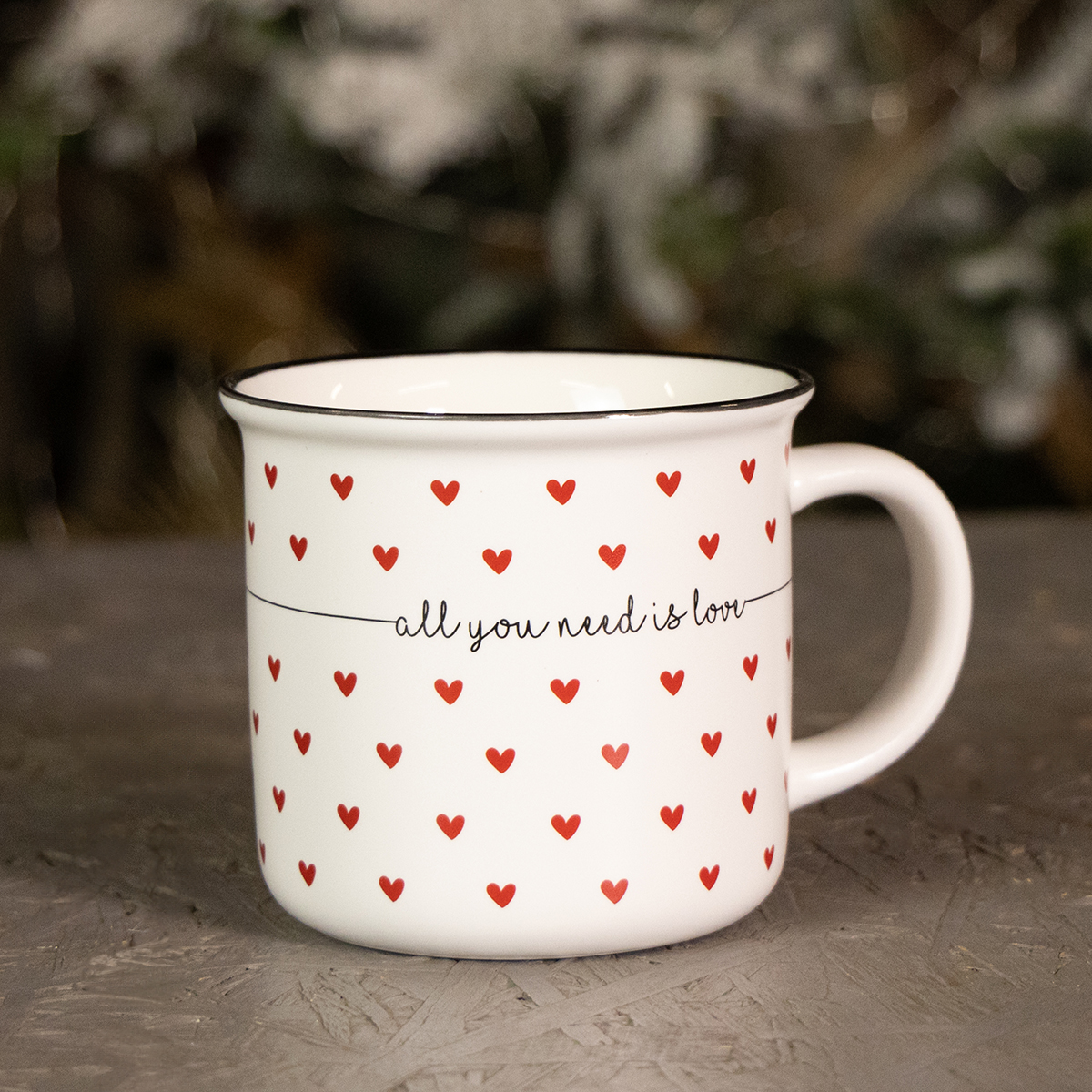 Esta caneca em formato de coração é mais do que apenas um recipiente para sua bebida favorita. Com seu design charmoso – fundo branco, pequenos corações vermelhos e a inscrição "All you need is love" – ela certamente colocará um sorriso em seu rosto. A borda preta fina adiciona um toque elegante e complementa perfeitamente o esquema de cores vermelho. A alça é confortável de segurar, enquanto a cerâmica promete um acabamento robusto e de alta qualidade. Ideal para usar no escritório ou como uma surpresa atenciosa para o café da manhã do seu amor. Quem ama o estilo escandinavo vai se apaixonar por esta mistura de simplicidade e romantismo. Que tal combinar a caneca com nossos guardanapos brancos e vermelhos ou com um buquê decorativo de rosas artificiais da Floristik24? Você verá: esta caneca combina perfeitamente tanto com cozinhas minimalistas quanto com cozinhas aconchegantes de estilo campestre, trazendo um toque de romantismo a qualquer ambiente.
