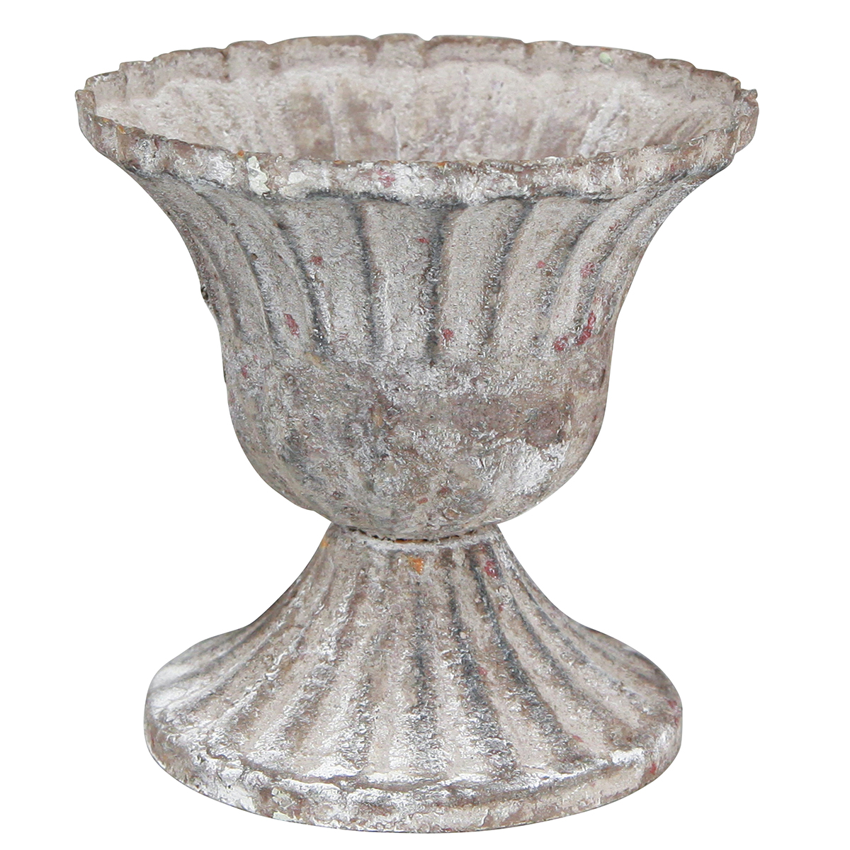 A taça antiga em cinza, ferrugem e branco é feita de metal e tem cerca de 8 centímetros de diâmetro na borda superior; o diâmetro da base é de aproximadamente 7 centímetros. A altura total é de cerca de 8,5 centímetros e a profundidade é de cerca de 5,5 centímetros.