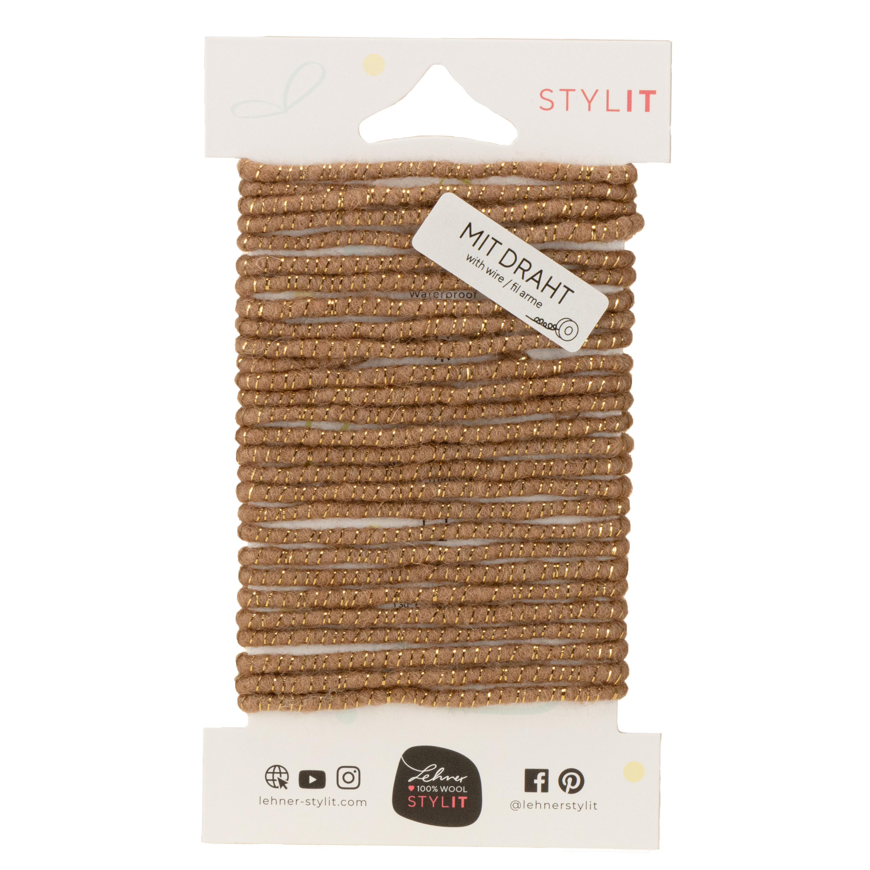 Este cordão de lã marrom e dourado é um verdadeiro coringa quando se trata de decoração, artesanato e projetos criativos. Feito de 100% lã e entrelaçado com finos e brilhantes detalhes em lurex dourado, possui um visual particularmente sofisticado. Perfeito para adicionar um toque aconchegante e elegante a qualquer projeto. O arame interno mantém o cordão no formato desejado e facilita muito a criação de diversos formatos – desde delicados laços até laços e espirais mais elaborados.
