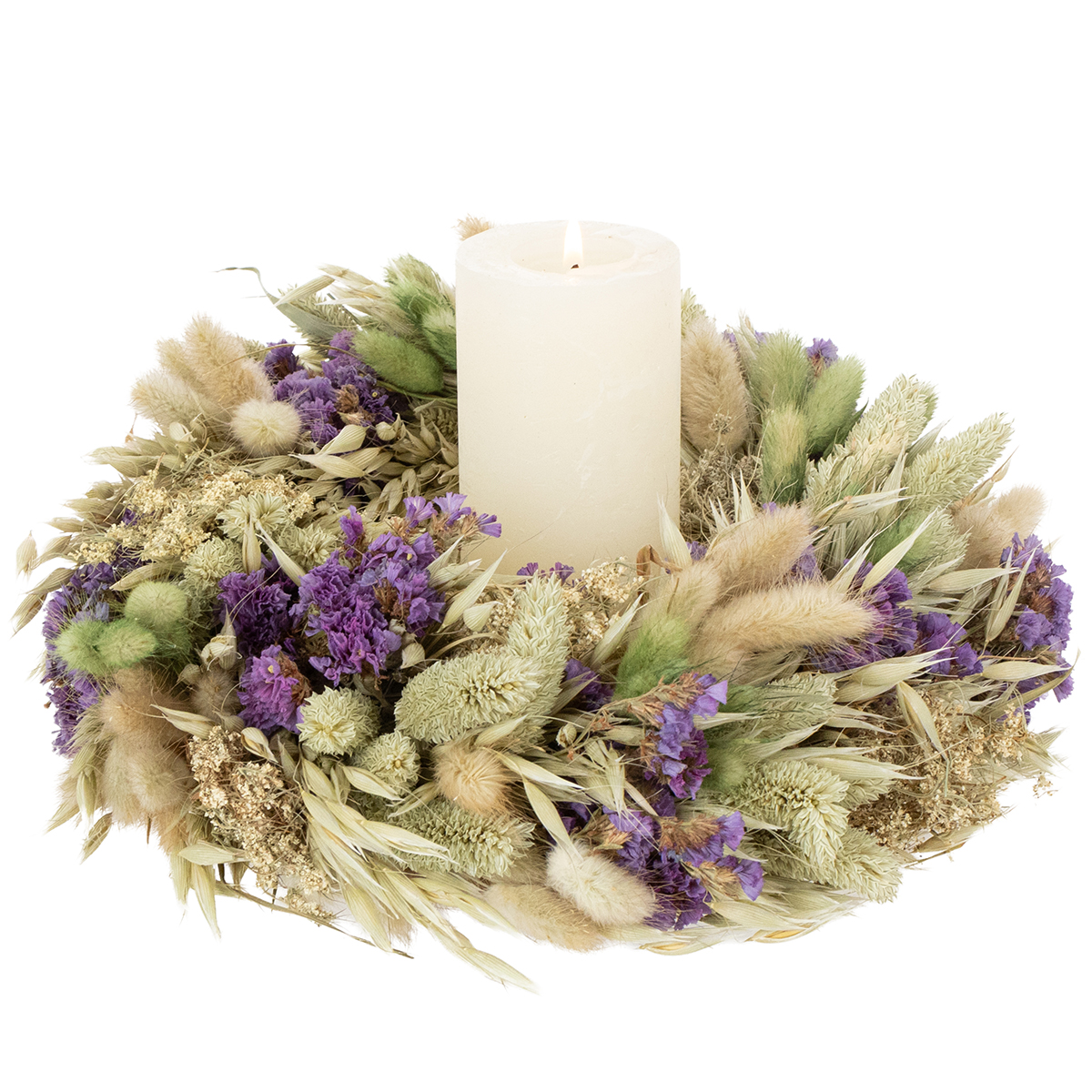 Uma coroa decorativa de flores secas que traz a primavera para você.