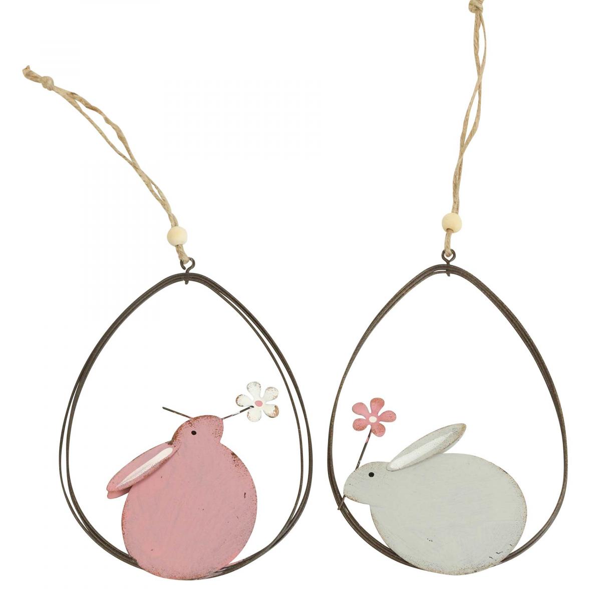 Estes coelhinhos da Páscoa de metal no ovo são uma linda decoração colorida para pendurar na porta ou como decoração de janela para a Páscoa.Um coelhinho da Páscoa rosa é mostrado voltado para a direita e um coelhinho cinza para a esquerda. Ambos os coelhos estão sentados e têm uma única flor na boca.