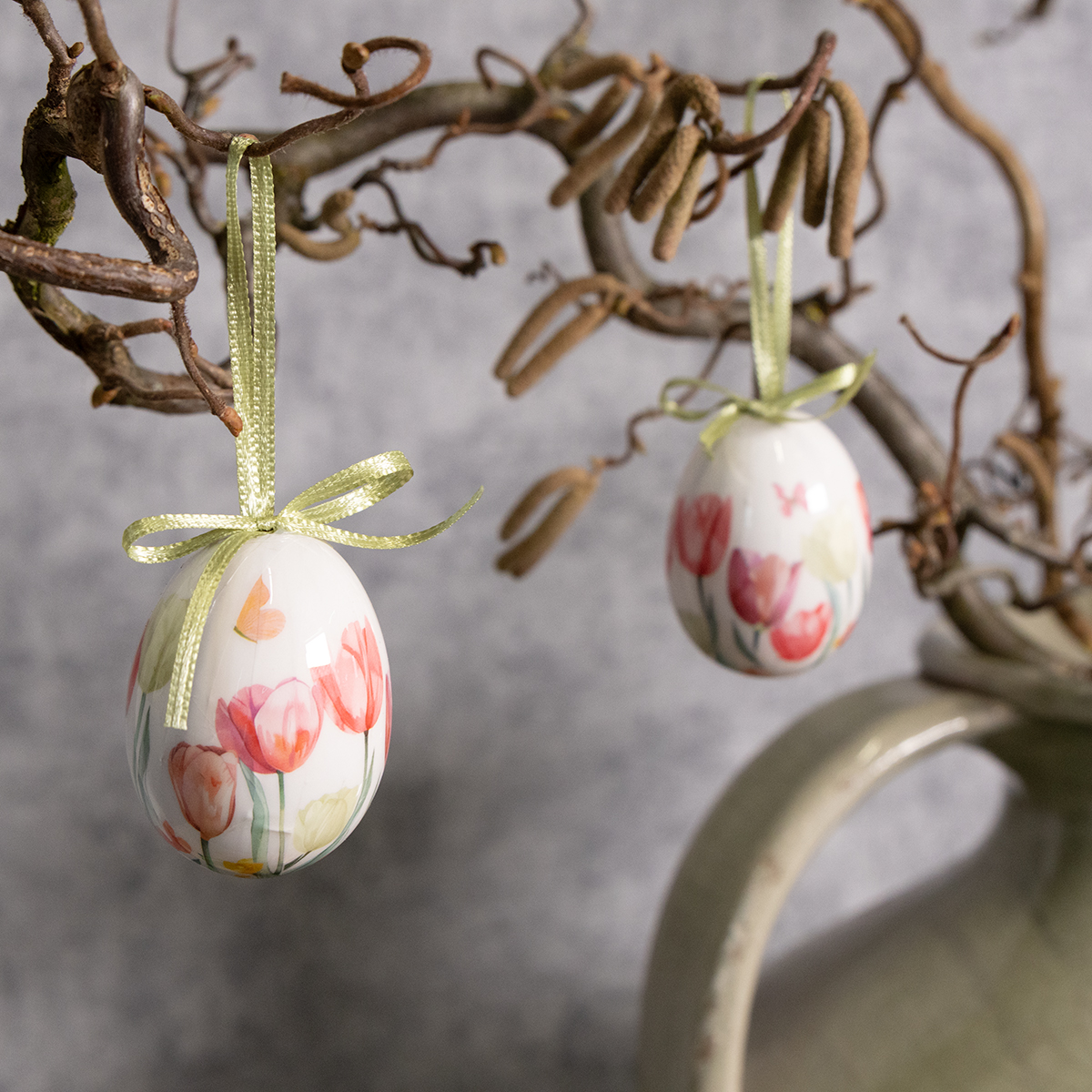 A primavera está quase aí! Já pensou na decoração de Páscoa? Que tal algo que seja não só atemporalmente belo, mas que também dê um toque de leveza a qualquer ambiente ou árvore de Páscoa? Nossos ovos de Páscoa decorativos com seu encantador motivo de tulipa são perfeitos. A fita inclusa facilita pendurar os ovos em galhos, janelas ou até mesmo na sua cesta de Páscoa. Quer surpreender seus convidados com uma mesa decorada com estilo? Estes ovos de Páscoa decorativos certamente encantarão qualquer amante da primavera. O brilho suave dos delicados motivos de tulipa, combinado com a base branca clássica, é perfeito para uma decoração rústica, mas também se harmoniza lindamente com interiores modernos e minimalistas. Veja você mesmo e traga a primavera para sua casa com estas decorações estilosas!