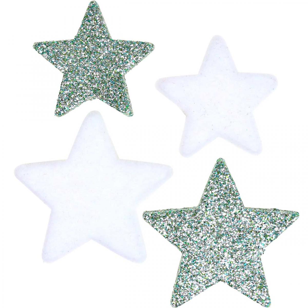 As estrelas de decoração de Natal vêm em dois tamanhos, flocadas ou brilhantes, num pack misto de cerca de 40 peças. Cada estrela de decoração de dispersão tem um diâmetro de cerca de 4 ou 5 centímetros.