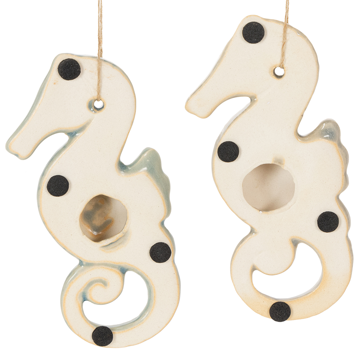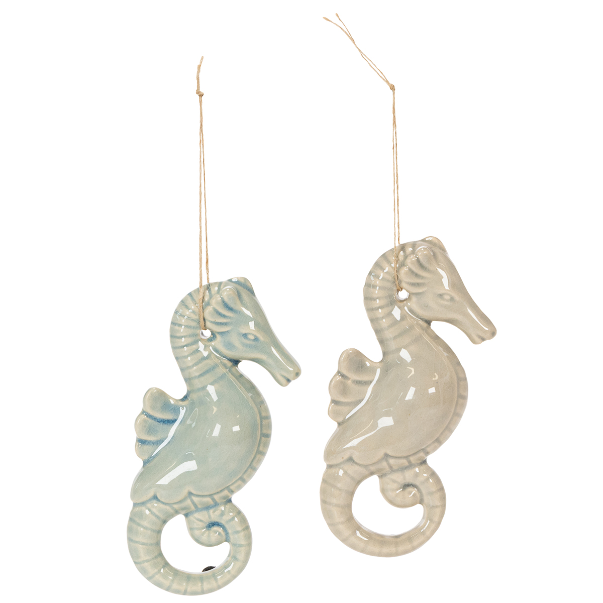 Decorações de cavalos-marinhos em cerâmica, como figuras de verão para pendurar.