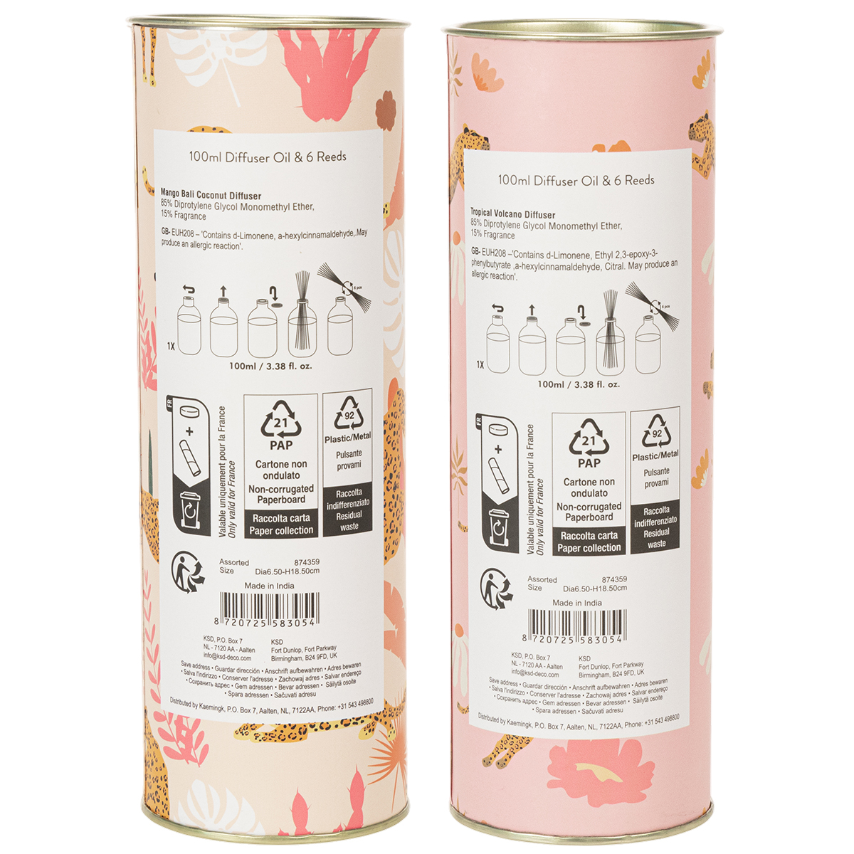 Estes difusores de ambiente libertam dois aromas irresistíveis: manga e coco. A combinação da doçura frutada com as notas tropicais cremosas cria uma atmosfera relaxante e convidativa no seu espaço. O conjunto de dois difusores permite perfumar a sua casa de diversas maneiras, adaptando-se perfeitamente aos seus espaços ou estados de espírito. Quer seja colocado numa mesa de apoio na sala de estar, usado como elemento decorativo na casa de banho ou como fragrância de boas-vindas na entrada, o difusor integra-se harmoniosamente em qualquer ambiente. Os frascos de vidro, com seis centímetros de diâmetro e 19 centímetros de altura, são não só práticos, como também visualmente apelativos com o seu design multicolorido.