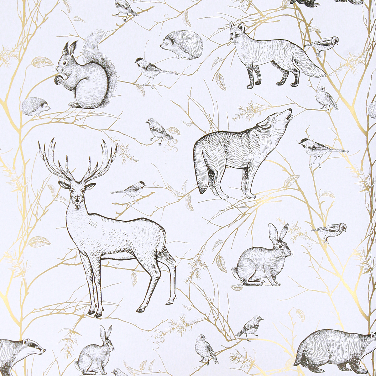 Papel de embrulho branco com animais pretos e cinza e galhos dourados - perfeito para presentes de outono e inverno