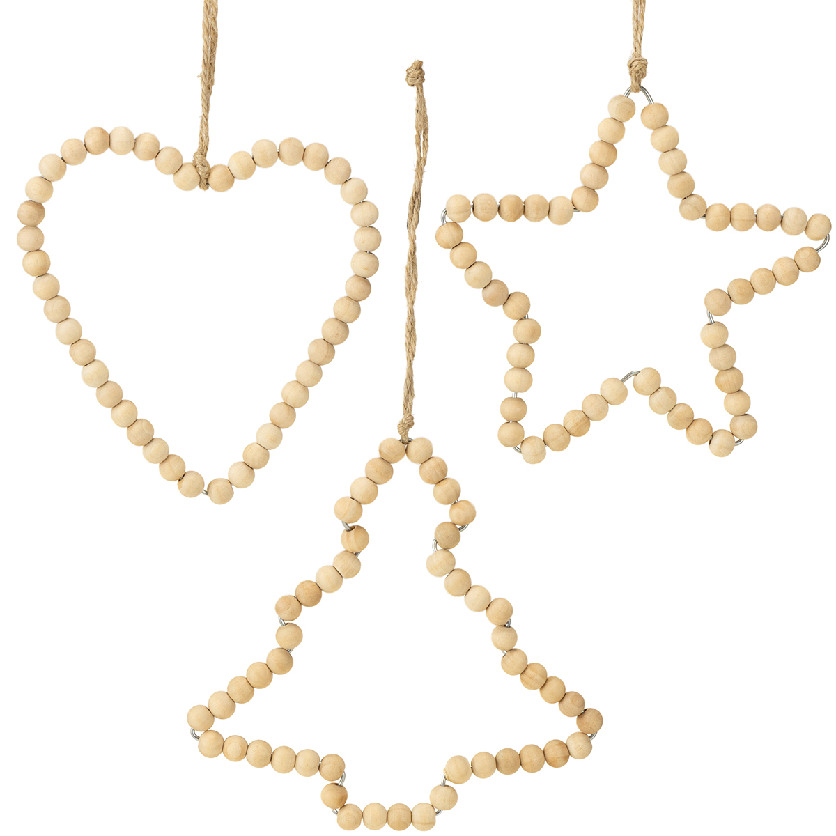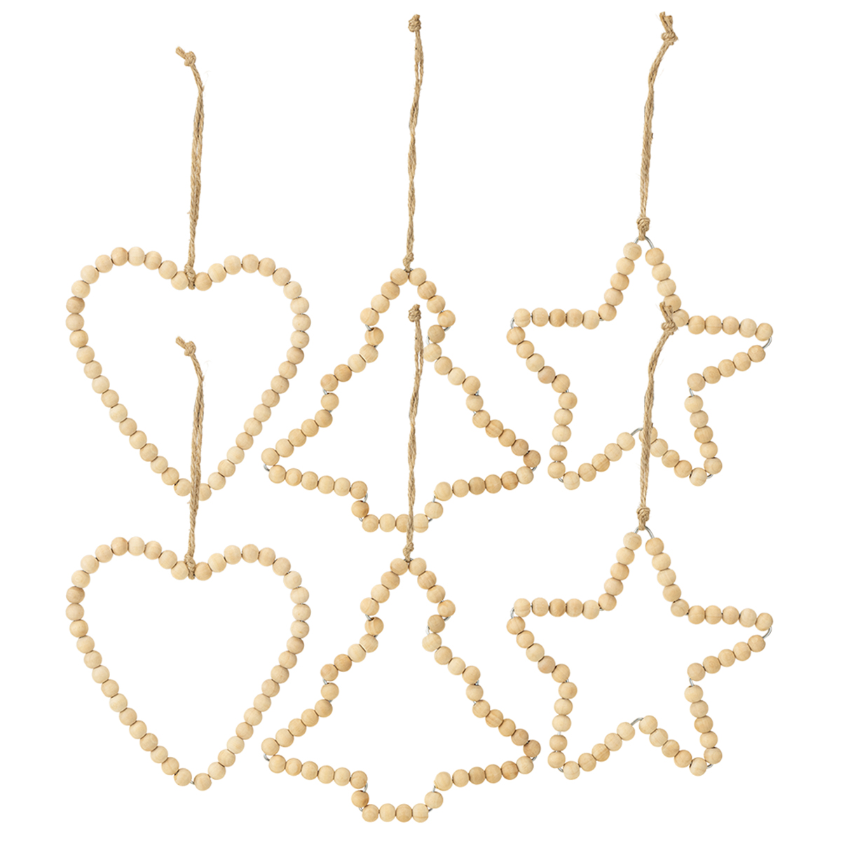 Enfeites de Natal: contas de madeira, coração, estrela, árvore, 13 cm de altura, 6 peças