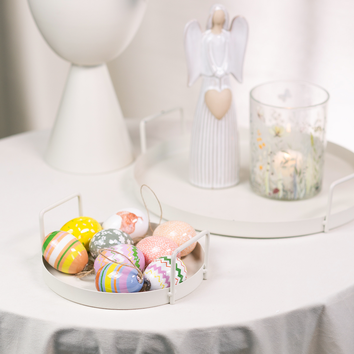 Estes encantadores enfeites de ovos de Páscoa são práticos e elegantes. Cada uma das doze miniaturas é cuidadosamente decorada com padrões delicados e impressiona pelo caráter atemporal de suas cores e designs. Seu tamanho prático de 6 cm é ideal para uma grande variedade de ideias de decoração. Graças ao material plástico resistente, os enfeites são duráveis e resistentes, adequados tanto para uso interno quanto externo protegido.
