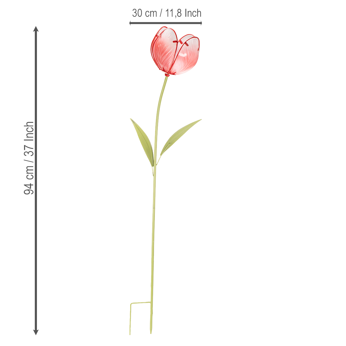 A estaca de jardim em forma de tulipa de vidro impressiona não apenas pelo seu design estético. Com suas generosas dimensões de 94 cm de altura e 13 cm de diâmetro, ela adiciona um toque marcante a qualquer espaço ao ar livre. A vibrante tulipa vermelha é feita de vidro resistente, durável e à prova de intempéries (embora não seja resistente à geada).