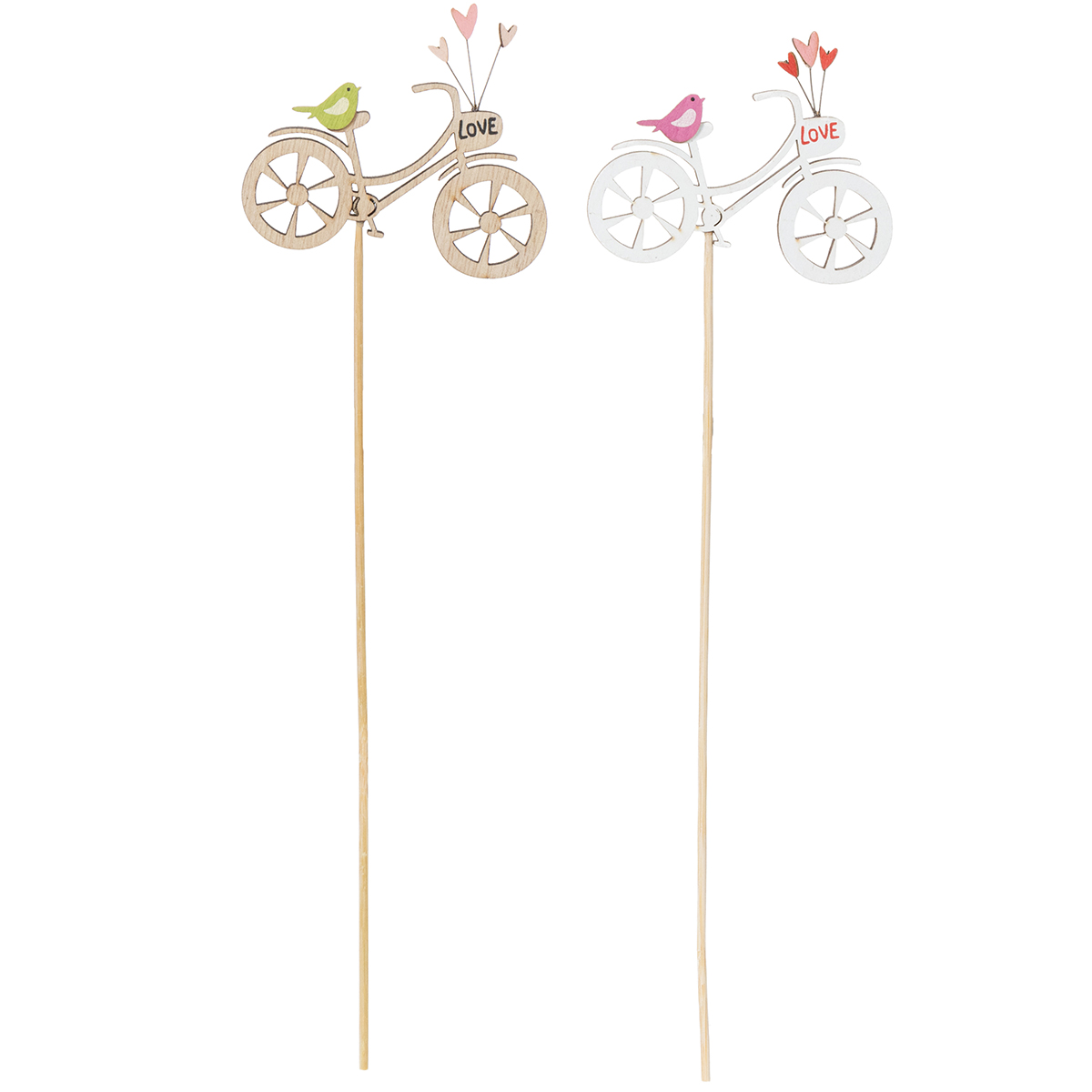 Com 29,5 cm de comprimento, estas estacas de madeira com motivos de bicicletas criam um ponto focal marcante e discreto. As delicadas bicicletas, adornadas com pequenos corações e passarinhos graciosos, irradiam pura alegria primaveril. A madeira natural tem um aspeto harmonioso e complementa quase qualquer estilo de decoração de interiores – seja escandinavo, campestre ou shabby chic. Um maravilhoso elemento decorativo para o pátio, jardim ou mesmo para interiores.